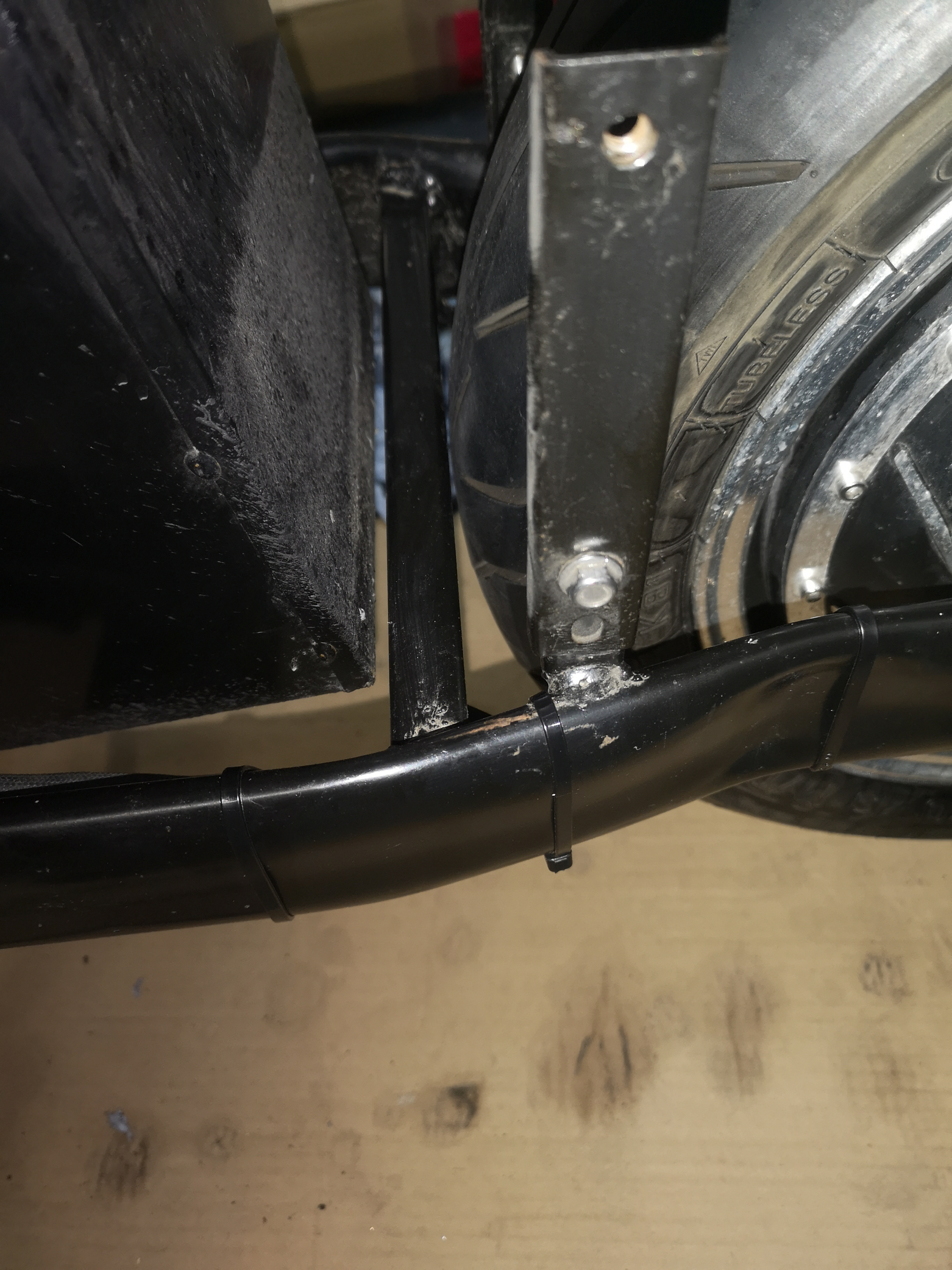 Vorne muss man ggfs. die steifen Kabel unter dem Rahmen etwas lösen und nach oben drücken. Den Controller konnte ich ohne Änderung der Kabel unter dem Fahrersitz unterbringen. Der Batteriekasten hat links und rechts außen Laschen mit einer Gewindebohrung. Da habe ich Gewindestangen reingedreht und und die Grundplatte des Controllers damit verschraubt. Zwischen Akku und Controller habe ich noch eine dicke Gummimatte zwischengelegt. Im vorderen Bereich musste ich das Helmfach etwas aufschneiden. Die Öffnung habe ich erstmal mit einer Gummimatte abgedeckt. Da muss aber noch eine Hardware-Lösung her....