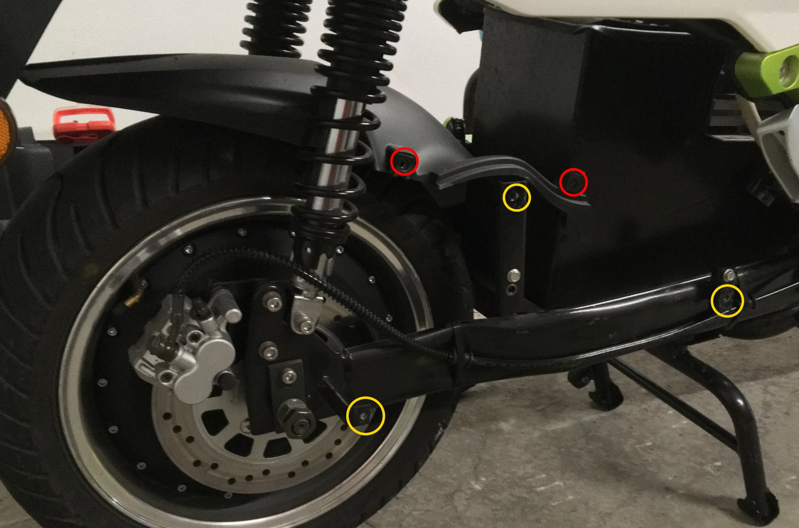 bei mir ist die Hinterradabdeckung mit je 2 Schrauben (rot) und die Schwingenverkleidungen mit je 3 Schrauben(gelb) befestigt. (siehe Bild)