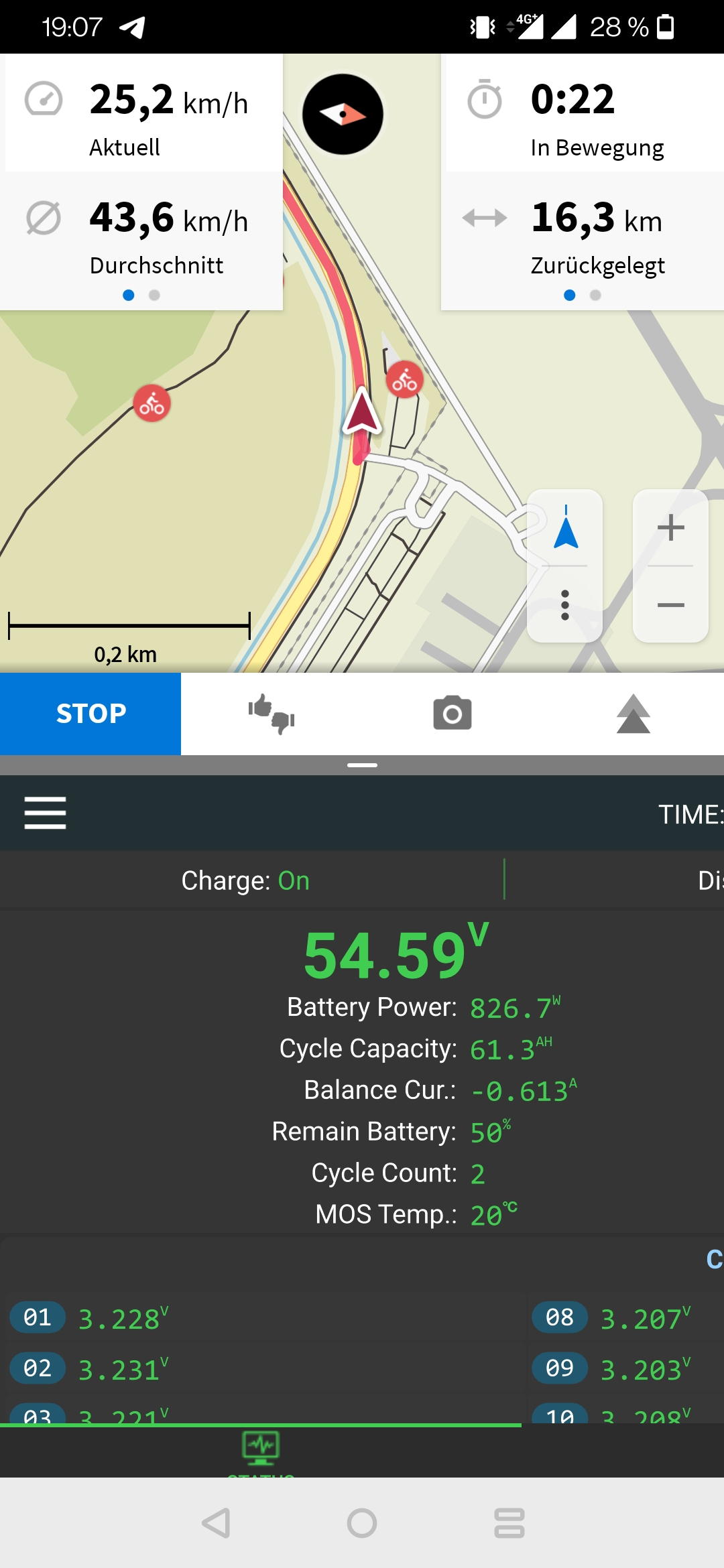 Heute von Hand balanciert, dann Gesamt und ab auf Probefahrt. Das Coulometer rechnet komplett anders wie das BMS. Der "günstige Originalcontroller" haut bei Vollgas immer 32 A(1600W) raus, der Roller2 hat ja mit 4,5 kW(70A) beschleunigt aber dann bei normaler Fahrt nur 1200 Watt.