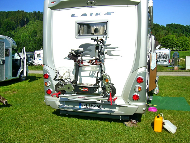 ich nehme meinen Scooter ( 47 Kg ) auf meinen Wohnmobilen schon einige 1000 Km auf einem ganz normalen Fahrradträger ( Tragkraft 60 Kg ) mit. Er ist nicht auf der Anhängerkupplung sondern an der Rückwand angeschraubt, aber die Fahrradträger für die Anhängerkupplung sind eher noch etwas stabiler, also ginge das auf alle Fälle. LG,