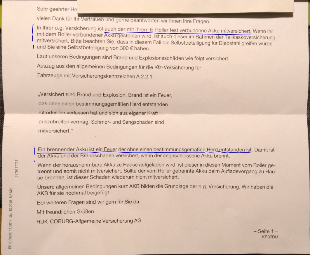 Ich habe dies schriftlich von der HUK erhalten, dass der Akku mitversichert ist.
