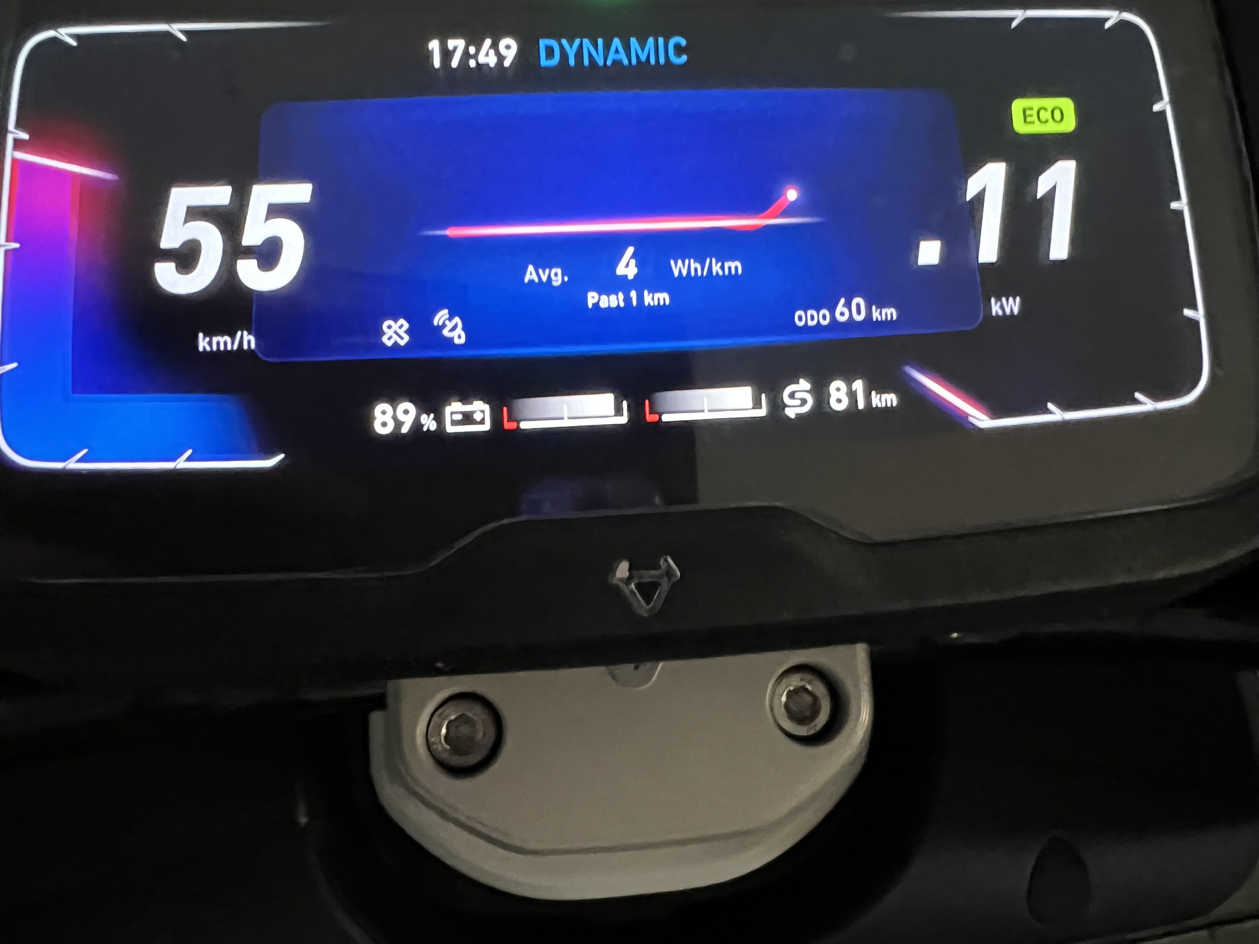 - Heute mal eine kurze Testfahrt zum maximalen Speed: Modus Sport, Akku 82 Prozent, lt. Display 89 km/h und lt GPS 85 km/h.