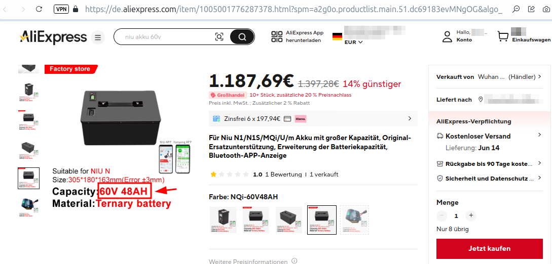 Vielleicht ist das an mir bisher vorbeigegangen, aber bei Aliexpress sah ich vor einigen Tagen erstmals ein Angebot über eine 60V / 48Ah -Batterie für NIU-Roller.
