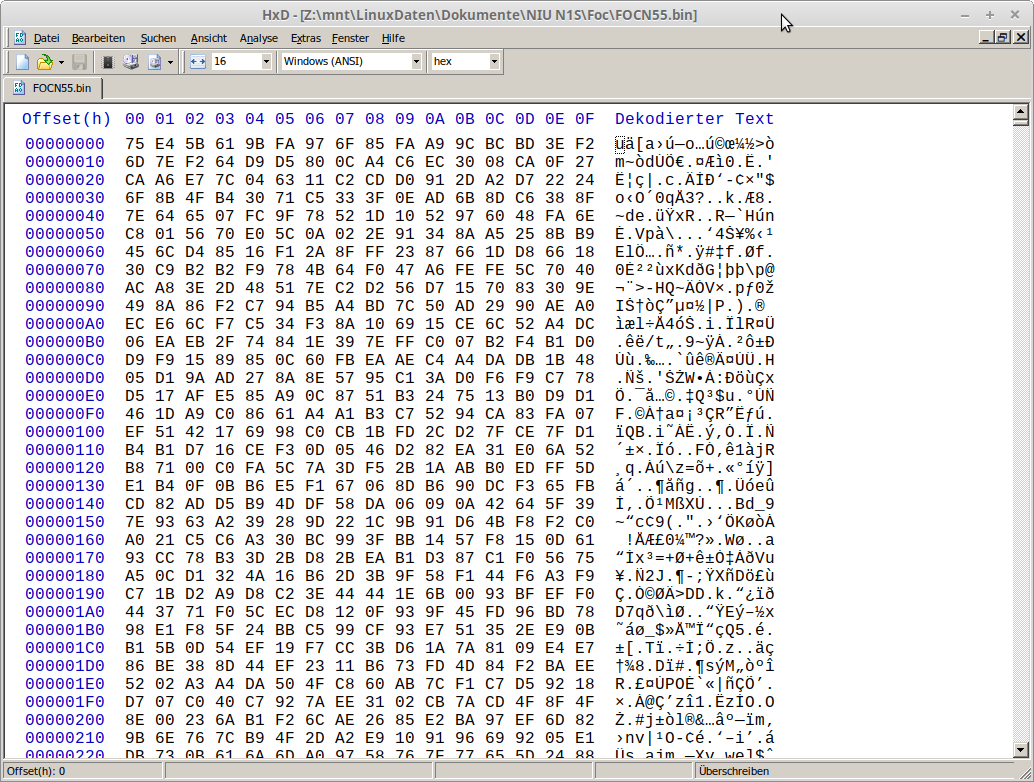 Also, mein Hex-Editor zeigt im 1. Teil einen mit Sicherheit verschlüsselten Datenbereich da keine 2 Bytes aufeinander einen gleichen Wert besitzen.