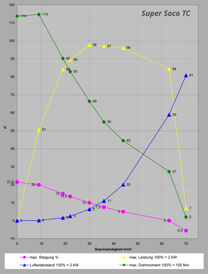 Die maximal bei der Geschwindigkeit noch fahrbare Steigung ist in magenta Aufgetragen, in Prozent. Gilt bei einem Fahrzeuggewicht von brutto 195 kg (2 Akkus, Paralleler, 94 kg Fahrer, 5 kg Lederklamotten). Bei Stillstand sind 21,5% drin, bei 63 km/h kann in der Ebene gefahren werden (0%). Um 70 km/h zu erreichen braucht man schon ein Gefälle von 5,5%.