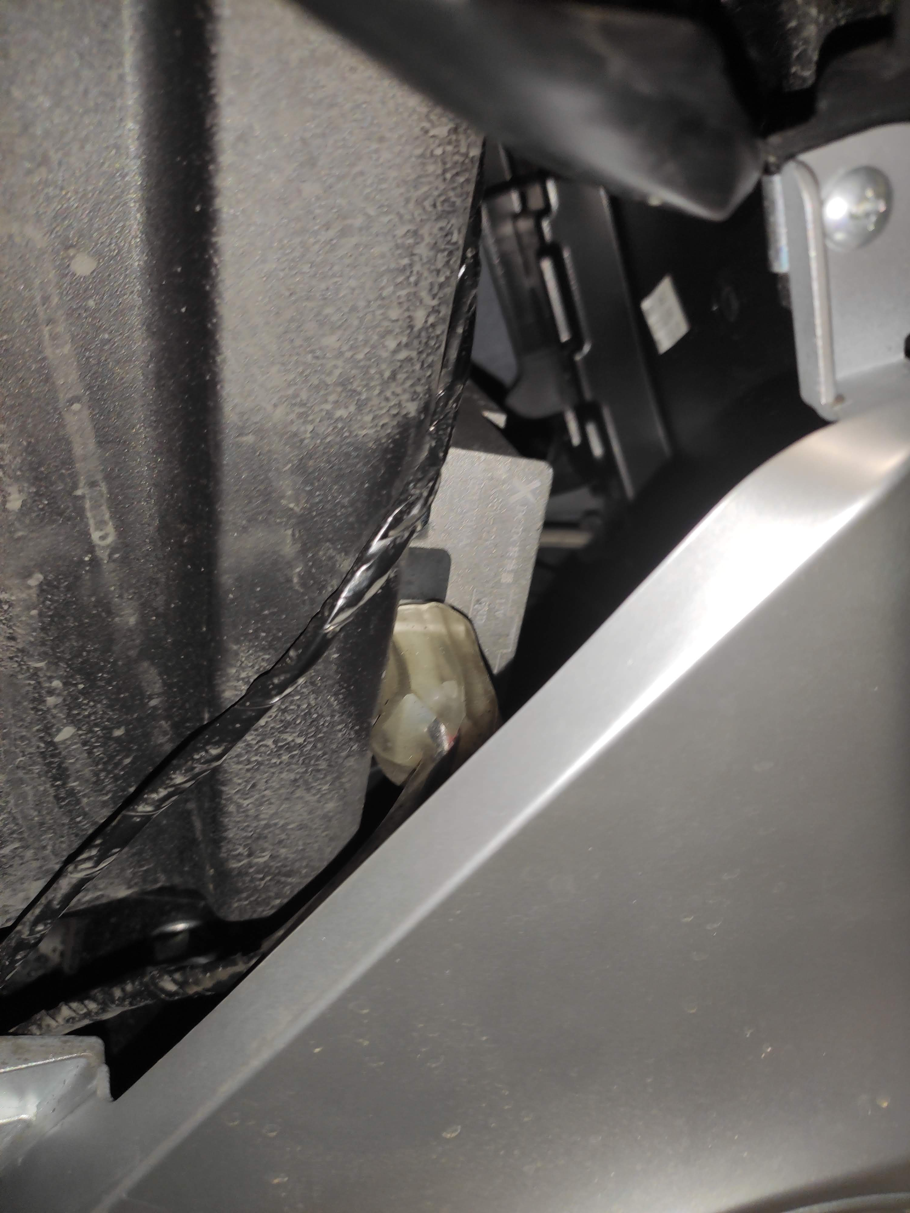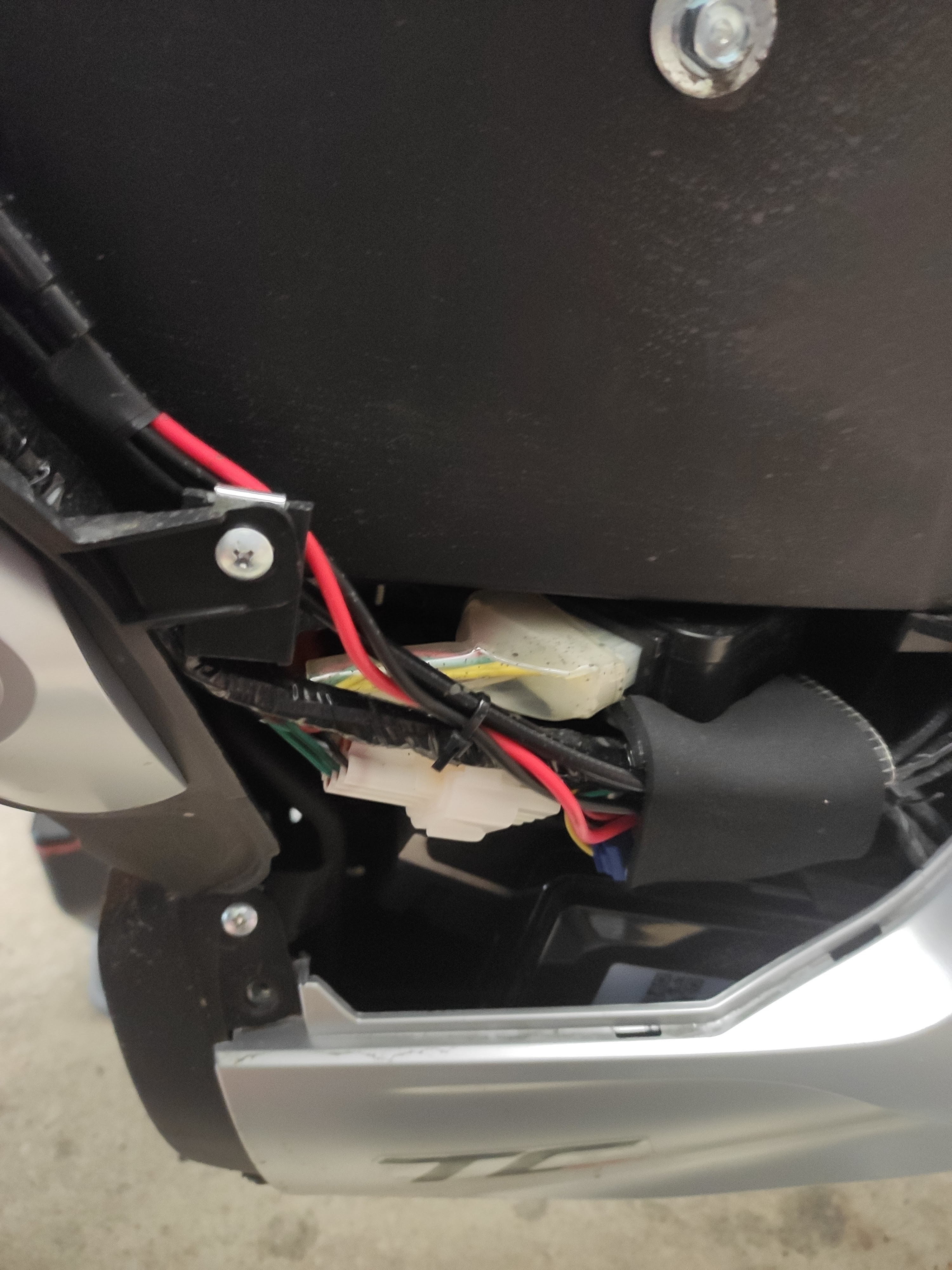 Jetzt erstmal quick'n'dirty mit einem Tape-Fähnchen und Klett das Kabel so fixiert, dass es bei Nicht-Nutzung fixiert und somit ruhig ist. Hab kurz gedacht, mir fällt gleich was vom Moped ab oder wir hätten irgend ein Kabel oder Stecker unter der Verkleidung nicht wieder richtig fixiert.