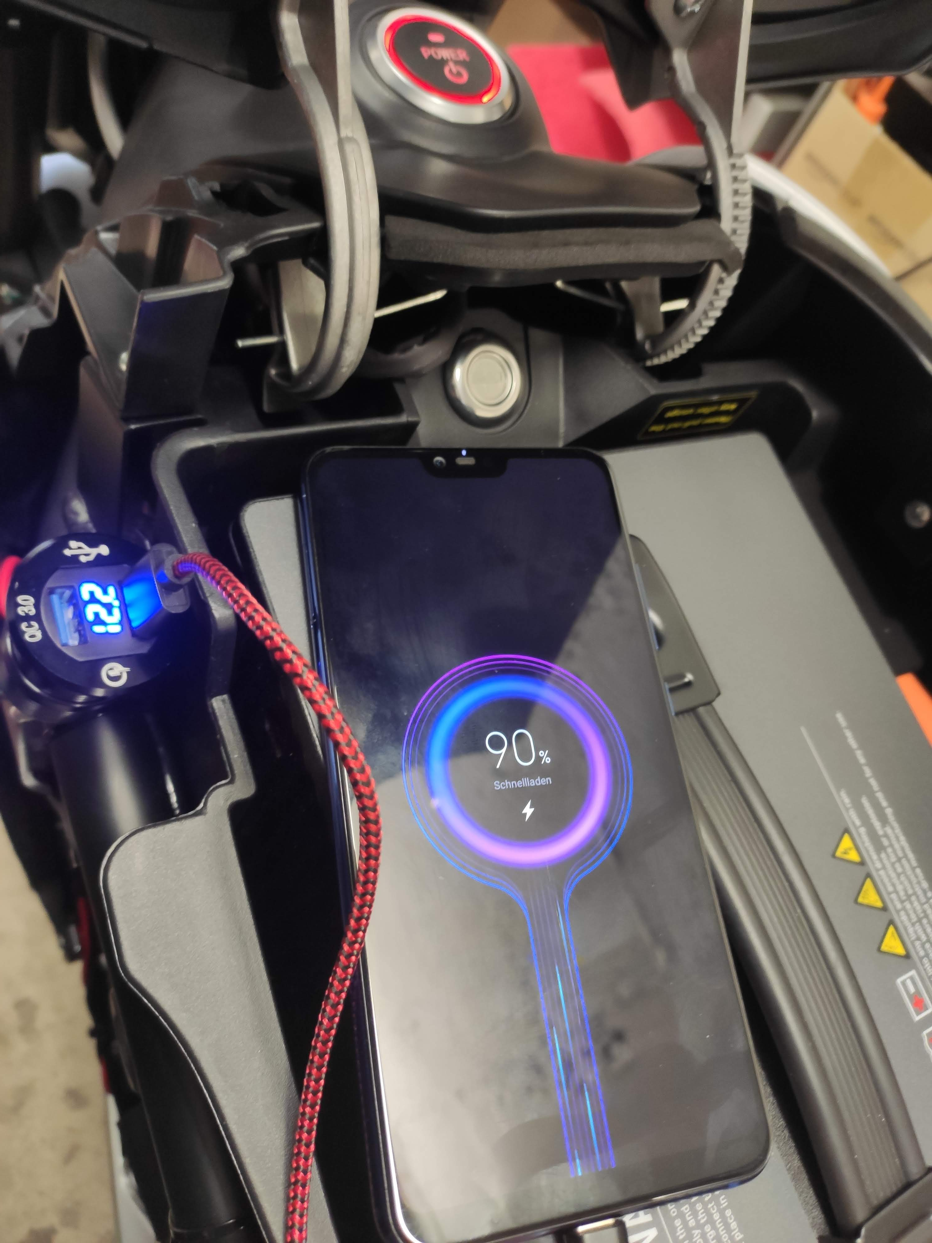 Ich hab jetzt an der dezent gepimpten TC Max meines Sohnes @Mozzie_50 auf Instagram endlich mal eine vernünftige USB Quickcharge-3 Steckdose (mit Voltmeter) verbaut, damit das Handy (als Voice Navi mit BT Earphone im Tankfach) nicht vom GPS leersaugt wird. (Den NIU Handyhalter haben wir wieder entfernt)