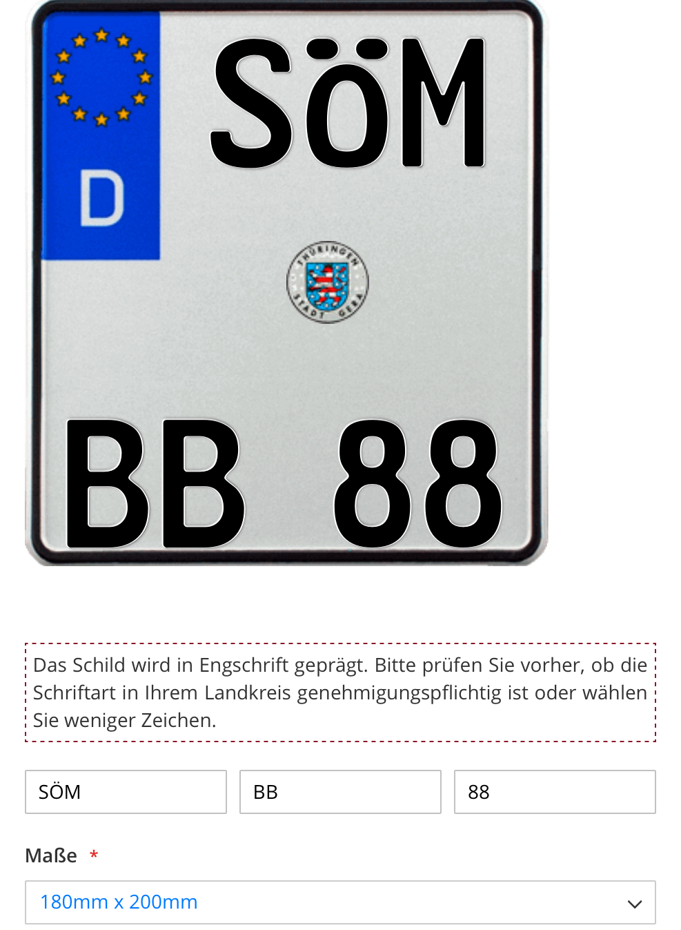 Also muss es ja doch funktionieren mit den 180er Schildern, vorausgesetzt es sind nur zwei Buchstaben. Wird bei mir "SÖM xxx" leider nicht funktionieren.