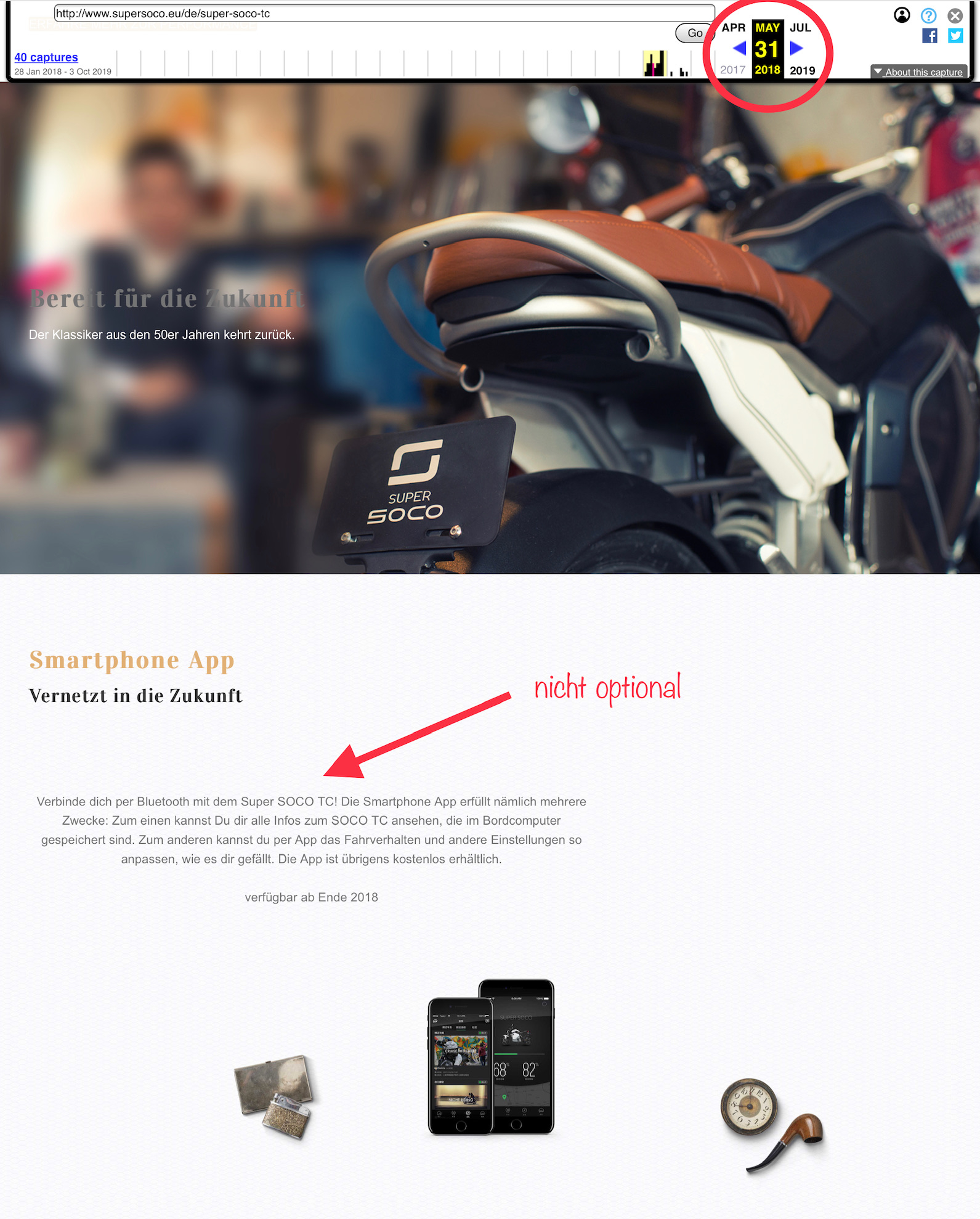 Ich fand das hier, vielleicht hilft das den Käufern von 2018 auch weitervsm hat geschrieben: ↑Mi 8. Mai 2019, 21:01Ich habe zwar tatsächlich noch den offiziellen Prospekt von 2018, allerdings wird der Dir wohl so nichts bringen. Dort steht nämlich "Super Soco App is available subject to countries". Vielleicht findest Du hier im Forum noch einen Screenshot von der deutschen Webseite, wo die "Connectivity" ja auch (den deutschen Kunden) versprochen wurde. Wenn ich mich recht erinnere, stand da ja auch, dass die App zur Connectivity gegen Ende 2018 kommen sollte.