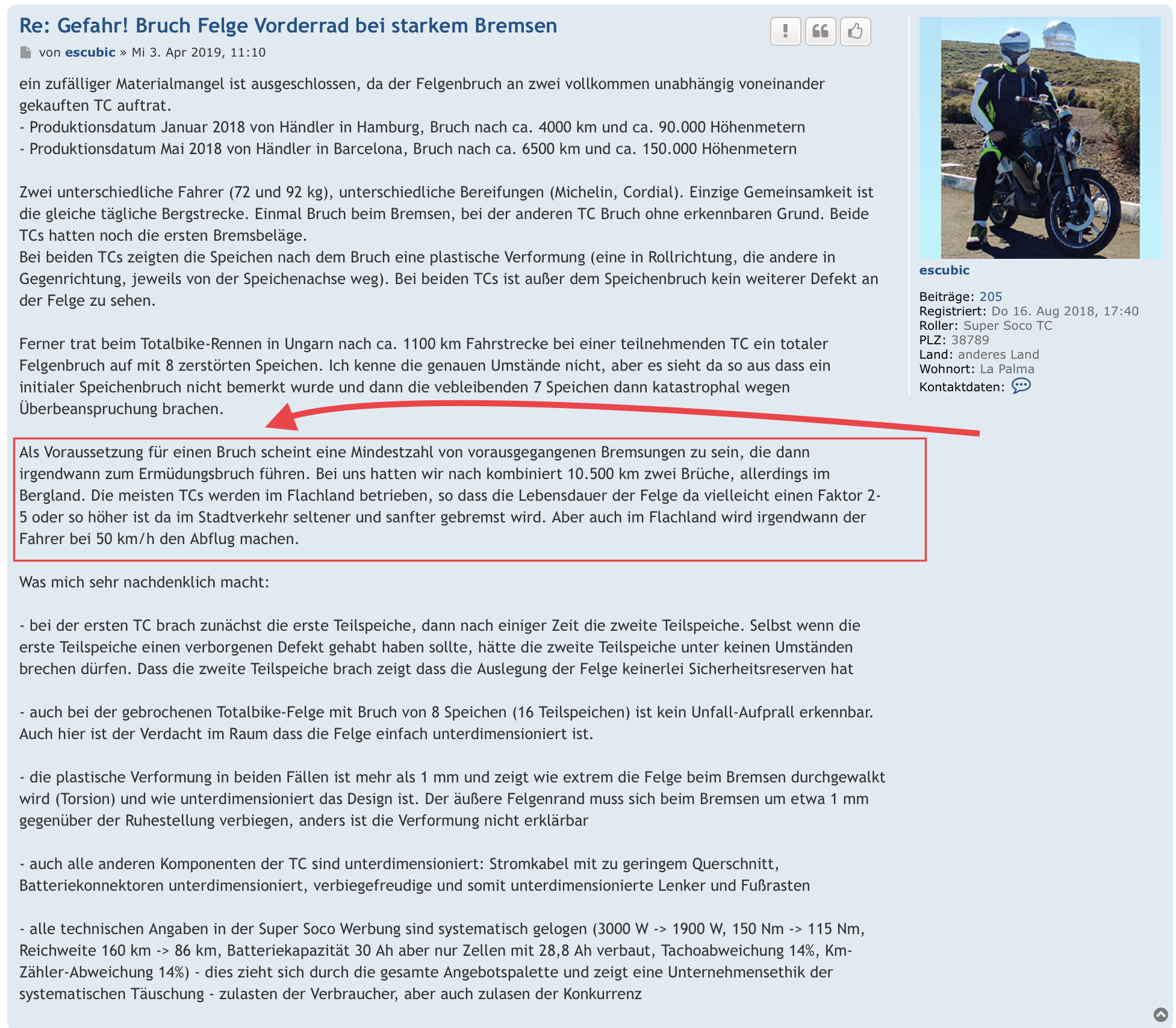 Meine einzige Hoffnung ist nun, dass die neue Felge ein Upgrade aufweist, indem diese Speichen verstärkt sind. Ein Freund meinte, ich sei zu schwer fpr die Soco, denn diese China-Geräte wären viel zu filigran ausgelegt.