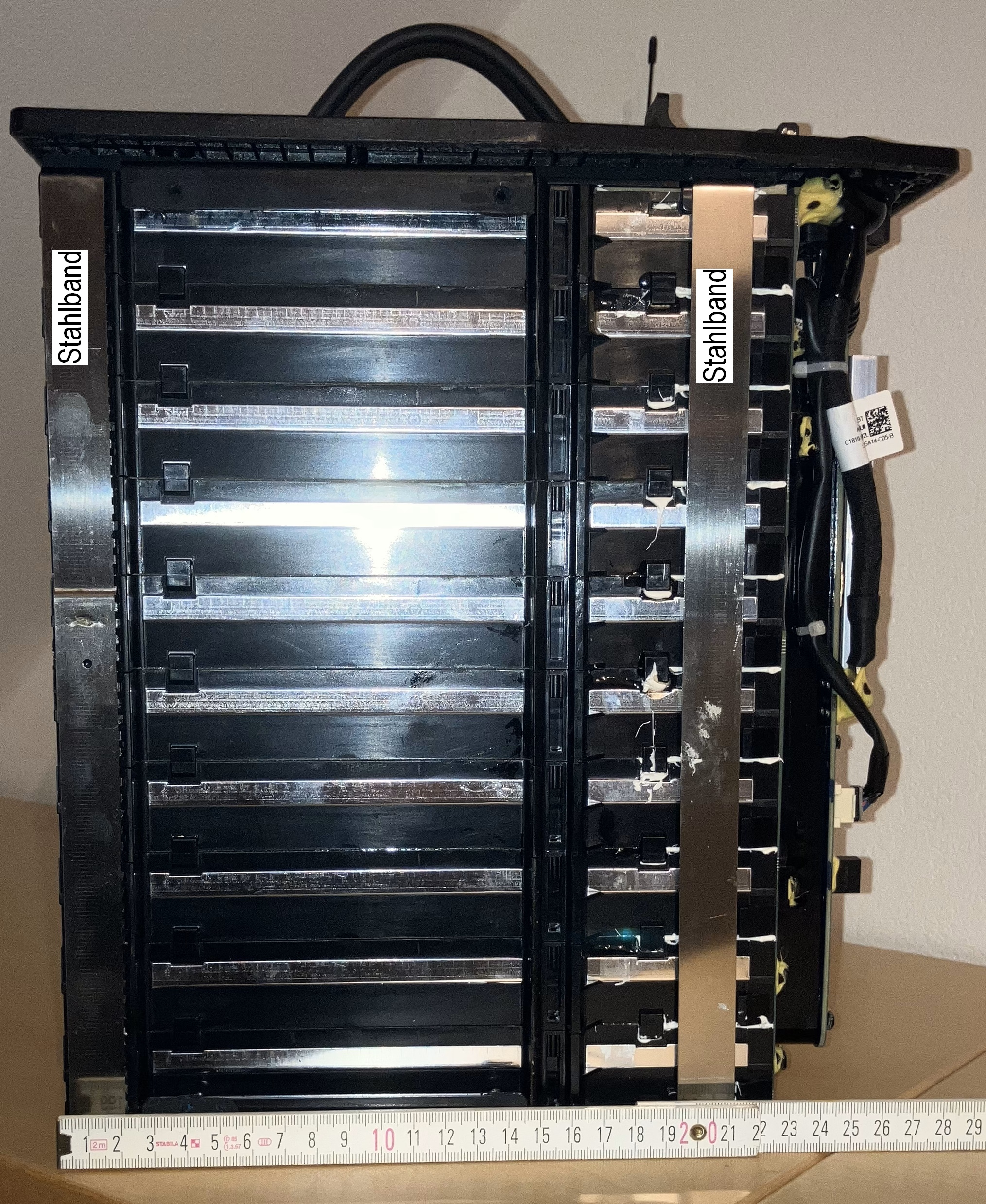 Im Inneren sind 10 Module mit den Abmessungen von ca. 120mm x 220mm verbaut, die mit zwei Stahlbändern umreift bzw. gesichert werden. Was für Zellen in den Modulen verbaut wurden konnte ich nicht erkennen,