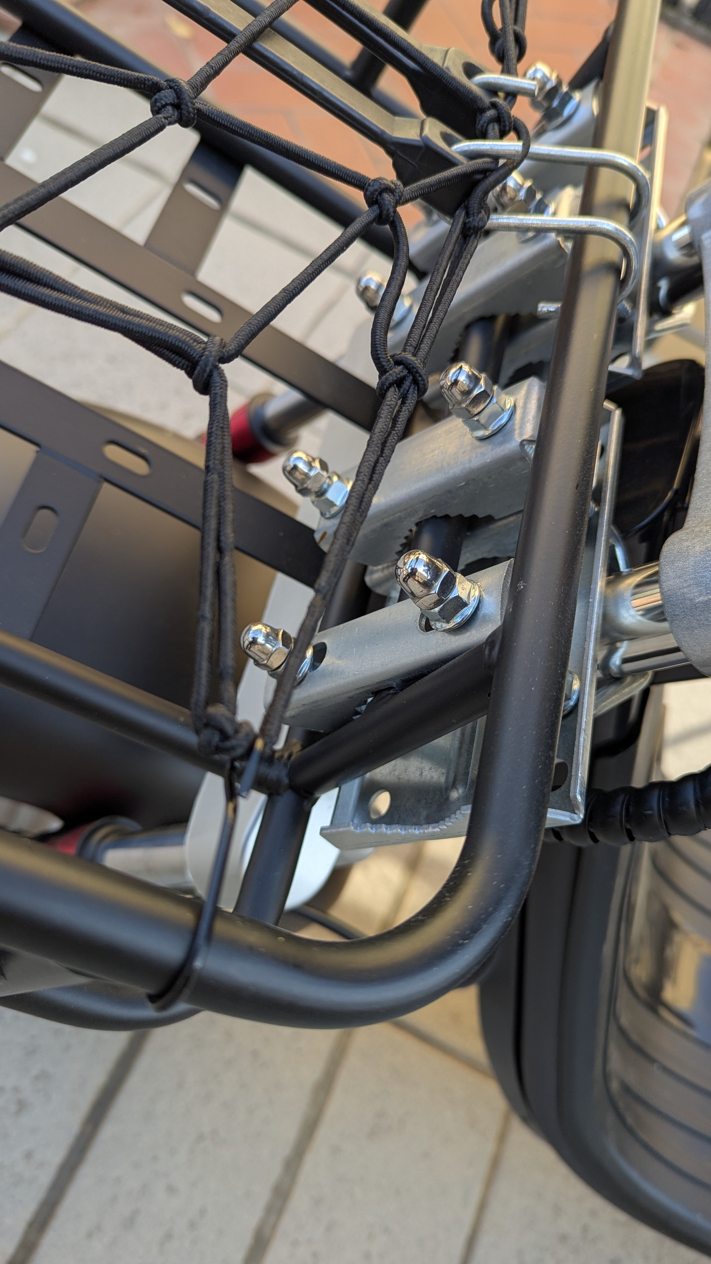 Korb (43x30x15 cm, es gibt auch größere und kleinere) und Befestigung (2x Antennenmast- Befestigung klein), beides von Amazon. Der solide Korb trägt leicht 10-15 kg, und die Befestigung ist tragfähig und in der Neigung einstellbar... Erleichtert den Supermarkt- Besuch...