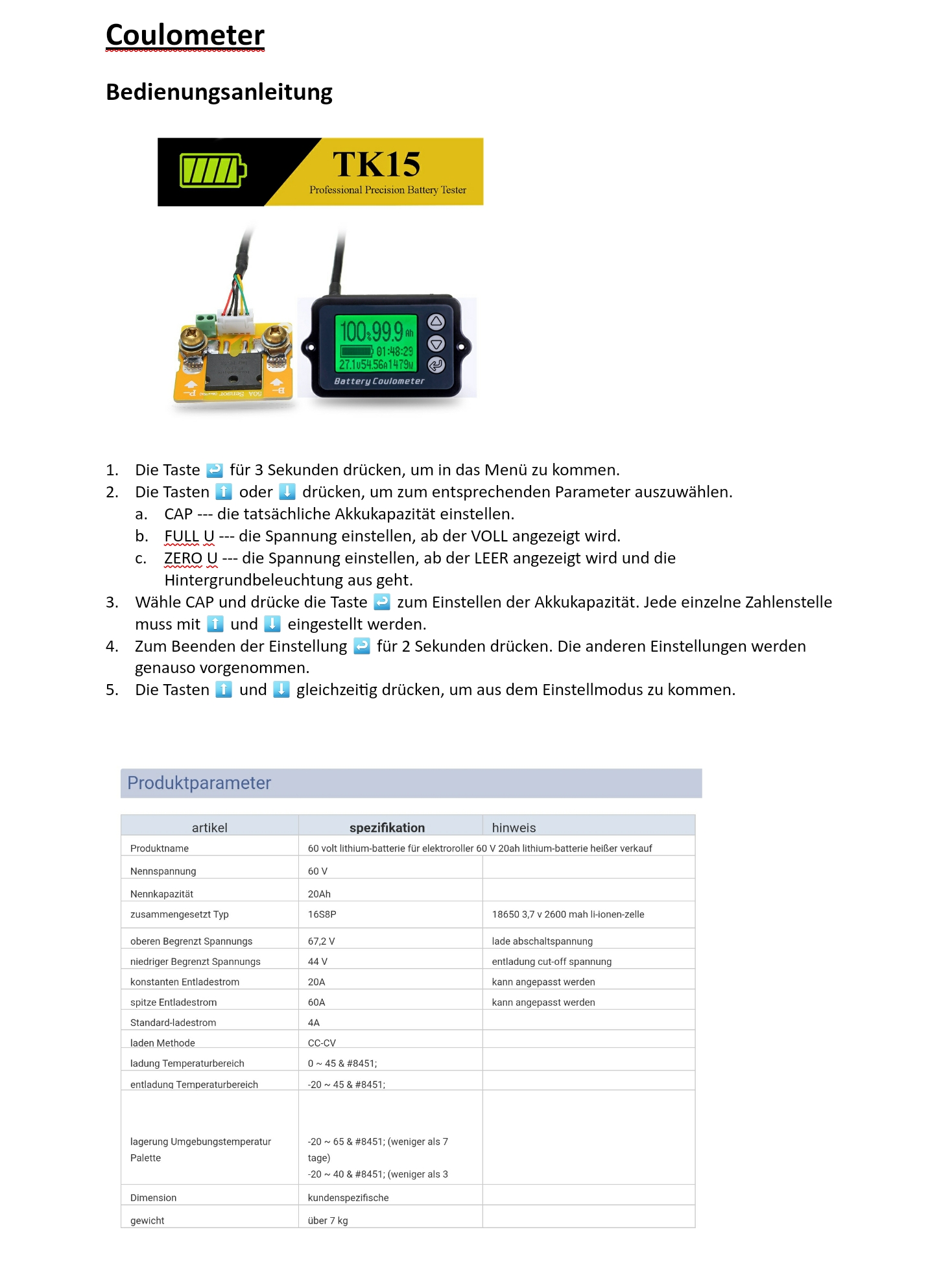 Wenn ich das richtig gesehen habe, wird ja auch die Kapazität des Akkus eingegeben, damit vernünftig runtergezählt werden kann. Hier würde ich 20-30% von den angegebenen 20 Ah abziehen, um nicht in die für den Akku "ungesunde" Zone zu kommen d.h. als Eingabe der Kapazität schlage ich 15Ah vor.