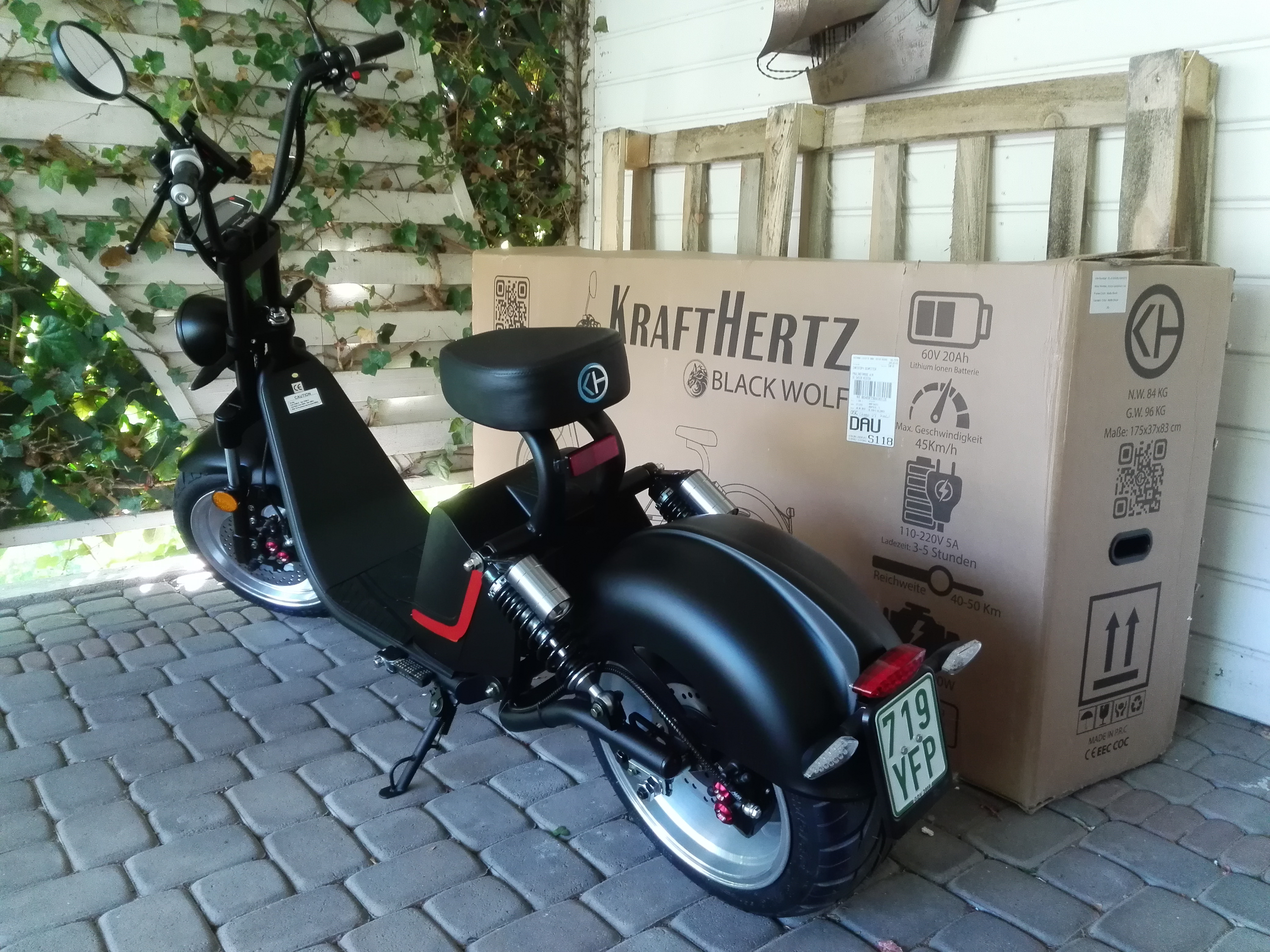Bestellt habe ich dann aber doch bei einem Händler in Deutschland. Bei einem Werkzeug- und Generatoren Händler, der unter dem Namen KraftHertz Black Wolf den Citycoco HL 3.0 von LUQI recht günstig anbietet. Sehr guter E-Mail und Telefonkontakt und blitzschnelle, versandkostenfreie Lieferung per Spedition in zwei Tagen nach Kauf. Der E-Scooter kam in einem stabilen Karton auf einer Palette sicher an. Die Montage war in gut zwei Stunden auch für eine handwerklich nicht so talentierte Person machbar, auch wenn keine Montageanleitung bei lag.
