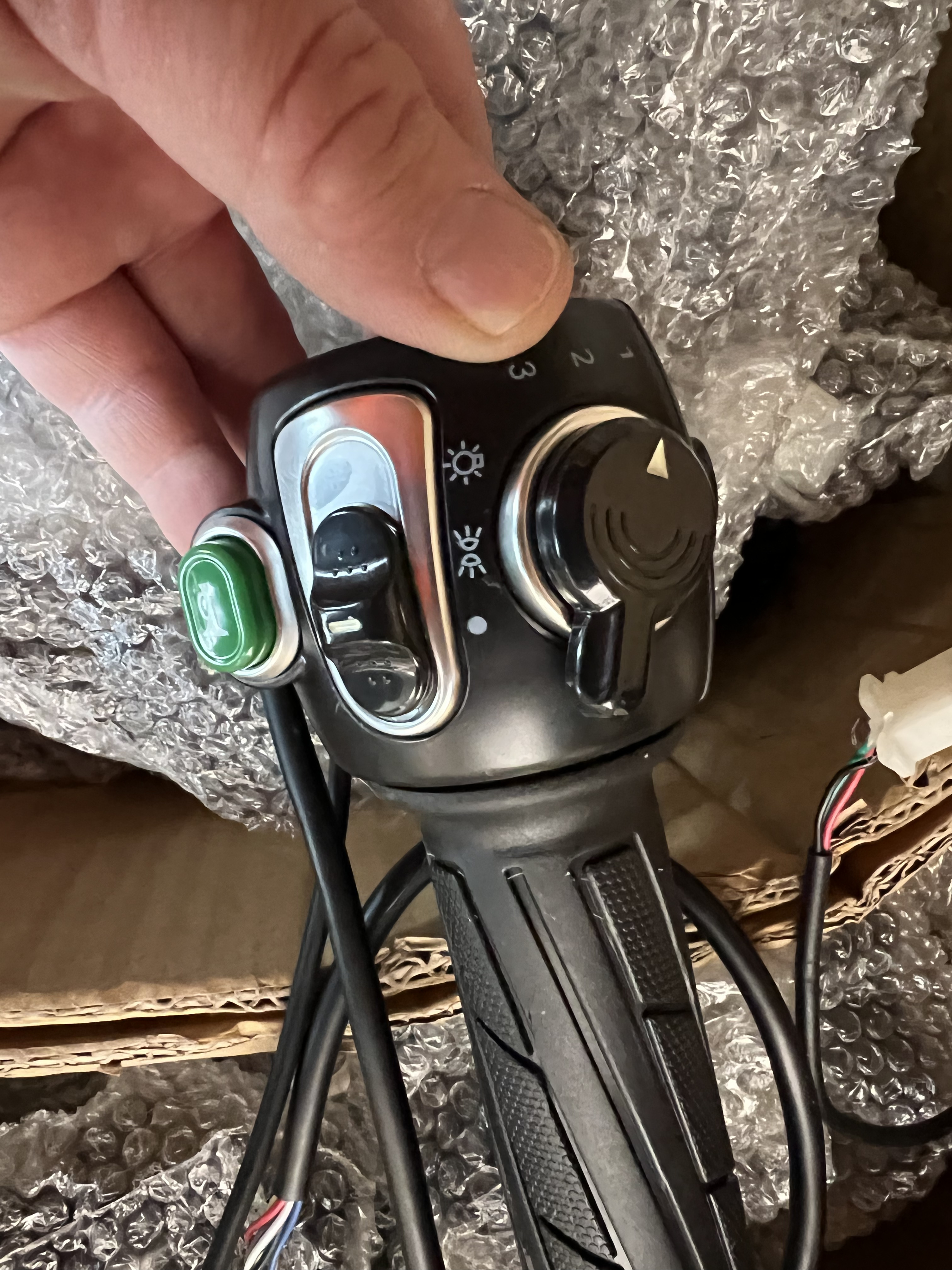 Auch Fahrzeuge von nova-motors.de verwenden solche Griffe mit Schalter. Da ist man mit über 100 Euro für das Paar Griffe dabei. Aber ohne Foto vom Stecker, mag ich die nicht empfehlen, weil die evtl. keine ControllerUmschaltung bewirken.
