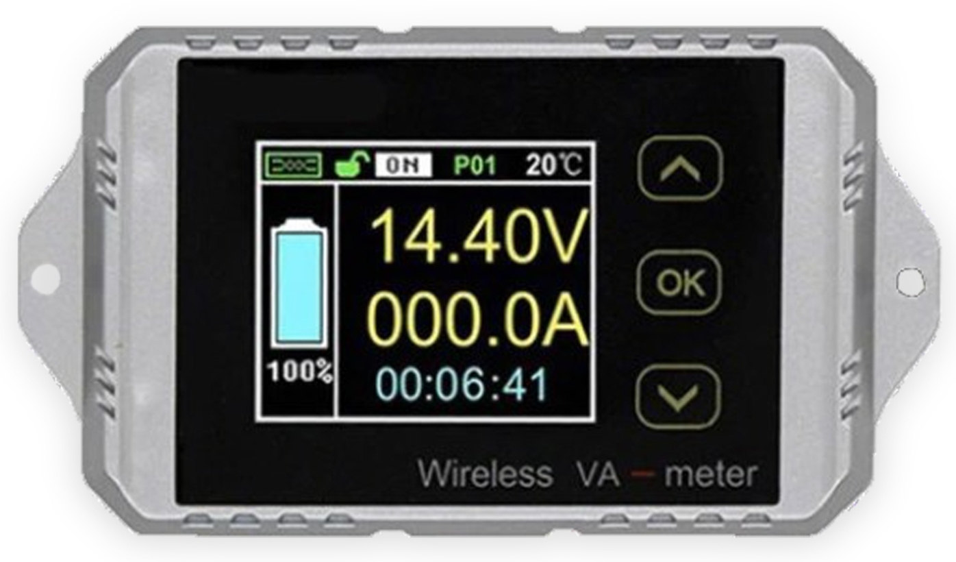 Der andere Knopf kurz halten stellt die Strommessung auf Null. Der Wert wandert um bis zu 0,3 A weg über Stunden scheint mir. Manchmal zeigt er auch minus an, er kann wahrscheinlich die Richtung anzeigen. Es ist auch ein Pfeil auf dem Abnehmer.