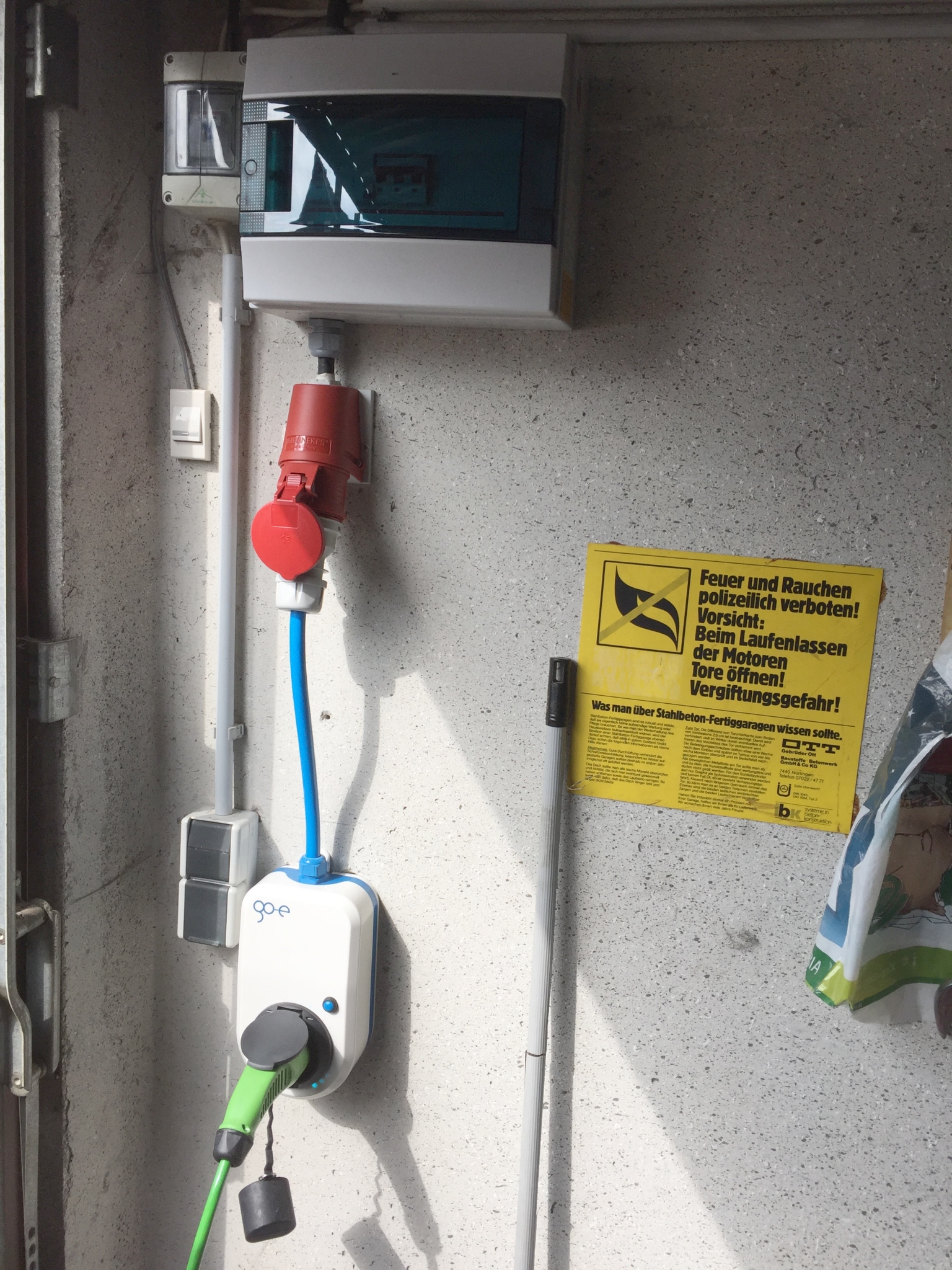 Ich musste die 32A CEE so nahe wie möglich an den Sicherungskasten hochversetzen, weil der Elektriker die damals etwa 1m über dem Boden angebracht hatte, so dass der go-a-Adapter fast am Boden gebaumelt wäre.