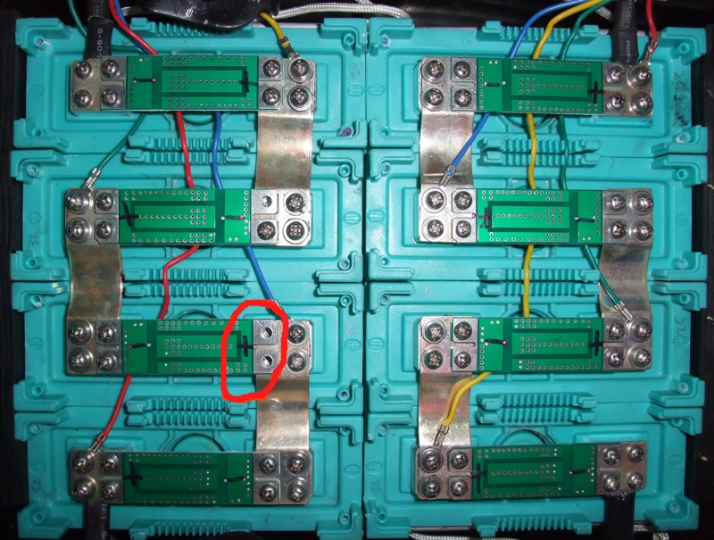 die Zellen haben Spannungen (Akkus vor 2 Tagen bis Abschaltung Ladegerät voll geladen) im Bereich 3.45 , 3.40 , 3.30 Volt (LiFePh 48V/40A, 1920Wh). Ausgerechnet die mit den fehlenden Schrauben hat dabei (nur) die 3.3 V. Zufall?