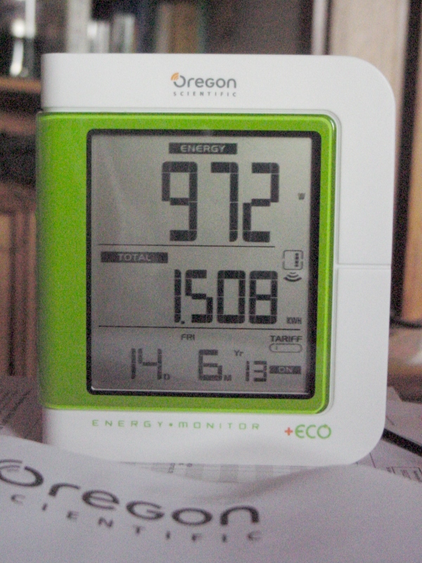Es ist eine Combo aus einer sehr schlicht aussehenden Zwischensteckdose (die es aber in sich hat) und einem Display mit Knöpfen und Sender-/Empfänger im 2,4GHz Frequenzband (wie z.B. Garagentor-Fernsteuerungen). Das Ding schimpft sich "Oregon Scientific ESM600 Wireless Appliance Manager", was die Anwendung schon ganz gut umschreibt.