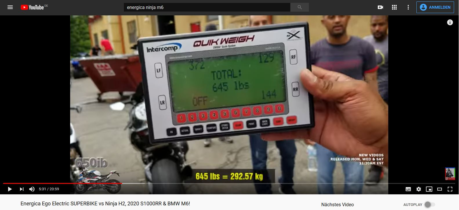 Der Youtube Kanal 650ib hat die Energica gewogen. Hier das Ergebnis: