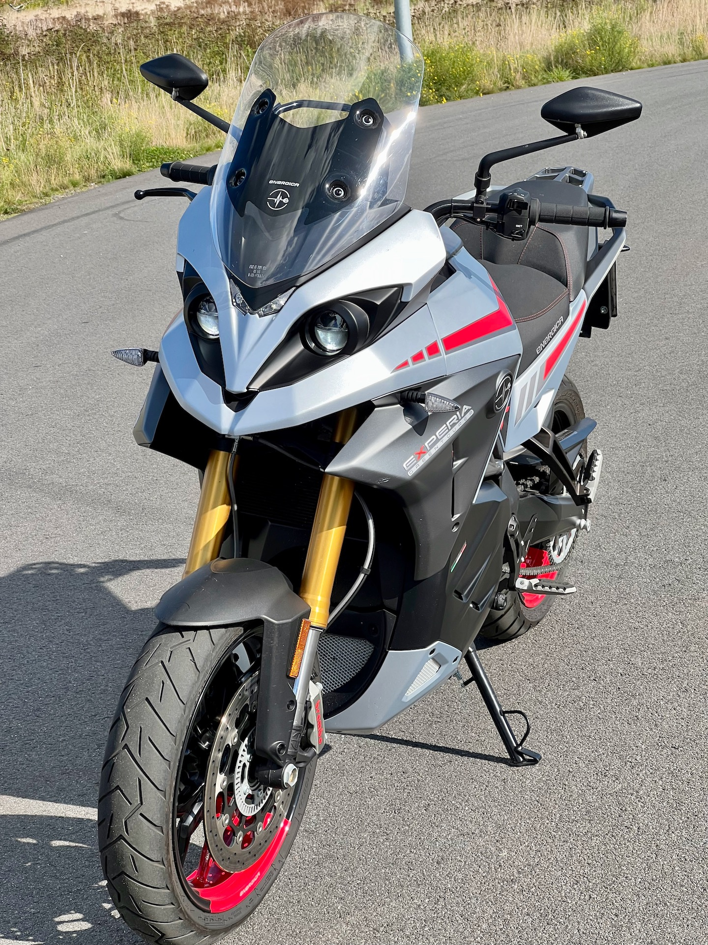 Erst mal im Menü volle Leistung und volle Reku eingestellt, und dann… Herrlich sattes Drehmoment! Kenn ich von der Ribelle, die davon noch ne Schüppe mehr hat. Und dann das Handling - ein Traum! Tiefer Schwerpunkt, gut ausbalanciert, absolut neutrales Einlenkverhalten. UND GENAU DAS HATTE ICH IN MEINEN 3 JAHREN ENERGICA VERMISST. Die Experia fährt sich auf den ersten Metern quasi wie ein Mountainbike. Gedacht, gelenkt, gefahren. Dieses Verhalten bleibt bis etwa 110km/h gleich, soweit eben wie ich es testen konnte. Die Ribelle liegt zwar noch satter auf der Straße, sie braucht aber mindestens 40 oder 50km/h, um danach erst neutraler zu werden. Und sie lenkt sich nicht so leicht. Die Experia zeigt das spielerisch-leichte Lenkverhalten** quasi aus dem Stand schon. Das konnte auch meine GS nicht besser!