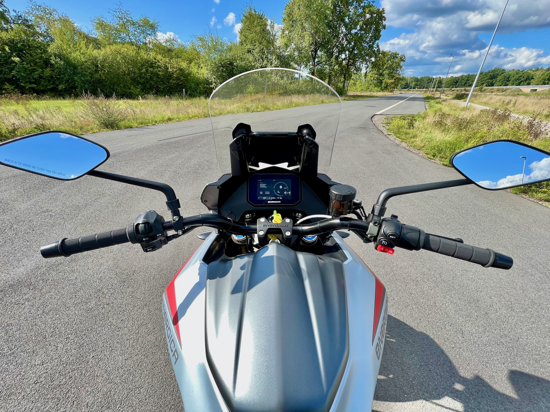 Die Spiegel sind hochwertig verarbeitet und sehen klasse aus - kennt man schon, die kommen aus dem Teileregal bei Energica. Obschon der Lenker meiner Ribelle gleich breit ist, sieht man auf der Experia weniger Schulter und mehr rückwärtiger Verkehr.