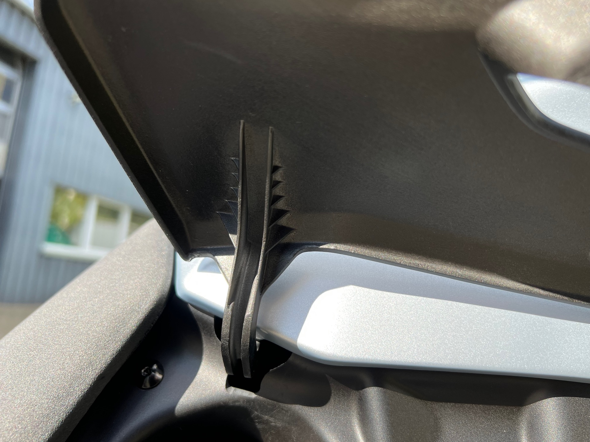 Bei der vorderen rechten Kunststoffverkleidung ist die Passung unsauber und es gibt einen auffälligen Versatz, aber mochmal: Vorserie! Hier würde ich erwarten, dass das für die Serie abgestellt ist. Der Lack macht einen „dünn rübergejauchten“ Eindruck. Dass die Kunststoff-Auskleidung um den Lenkkopf noch nicht genarbt sondern strichpolierte Oberflächen hat, liegt zweifellos auch noch an der Vorserie. Da kommt sicher noch eine einfache Erodiernarbe drauf, das wirkt dann erheblich wertiger. Es gibt viele recht großflächige Kunststoffteile, die eher billig klingen, wenn man mit dem Fingernagel dagegen trommelt. Nicht, dass ich jetzt der große Finger-Trommler wäre, es sind aber alles Punkte, wo es doch mit wenig Aufwand besser geht…
