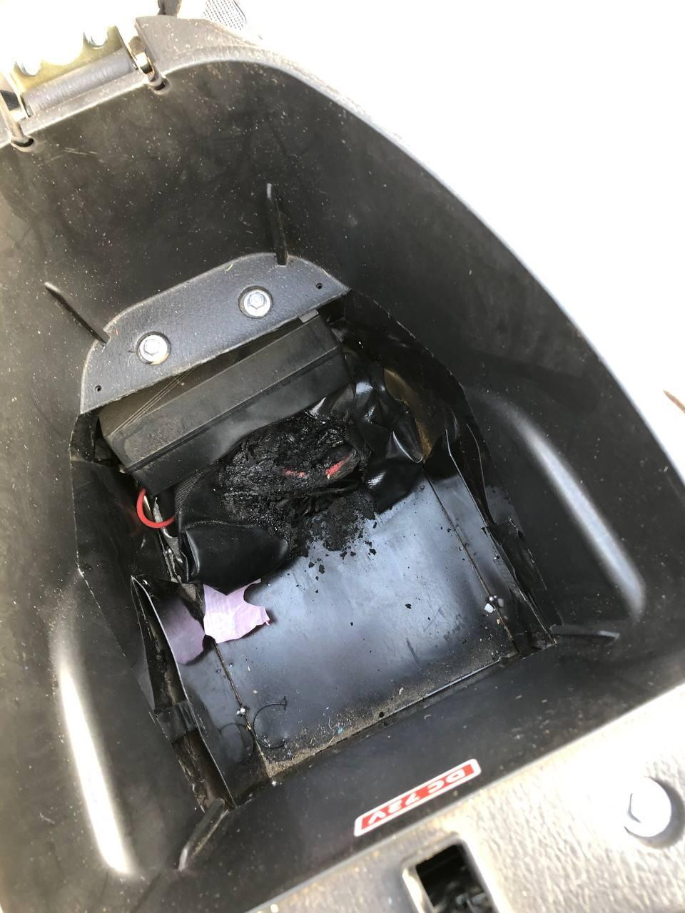 Ich konnte den Brand mit dem im Helmfach befindlichen Teppich (aus schlecht brennbaren Naturfasern) "löschen". Dann trennte ich die Stecker Verbindung zum Roller. Da ich nicht wusste, was genau die Branduhrsache ist und ich einige Filme aus dem Netzt von brennenden und gefühlt nie wieder erlöschenden LIPO eBike Akkus gesehen habe, rief ich die Feuerwehr, bevor die Situation aus dem Ruder läuft. Die Feuerwehr hat mit meiner Hilfe den Akku ausgebaut und in ein Wasserfass versenkt.