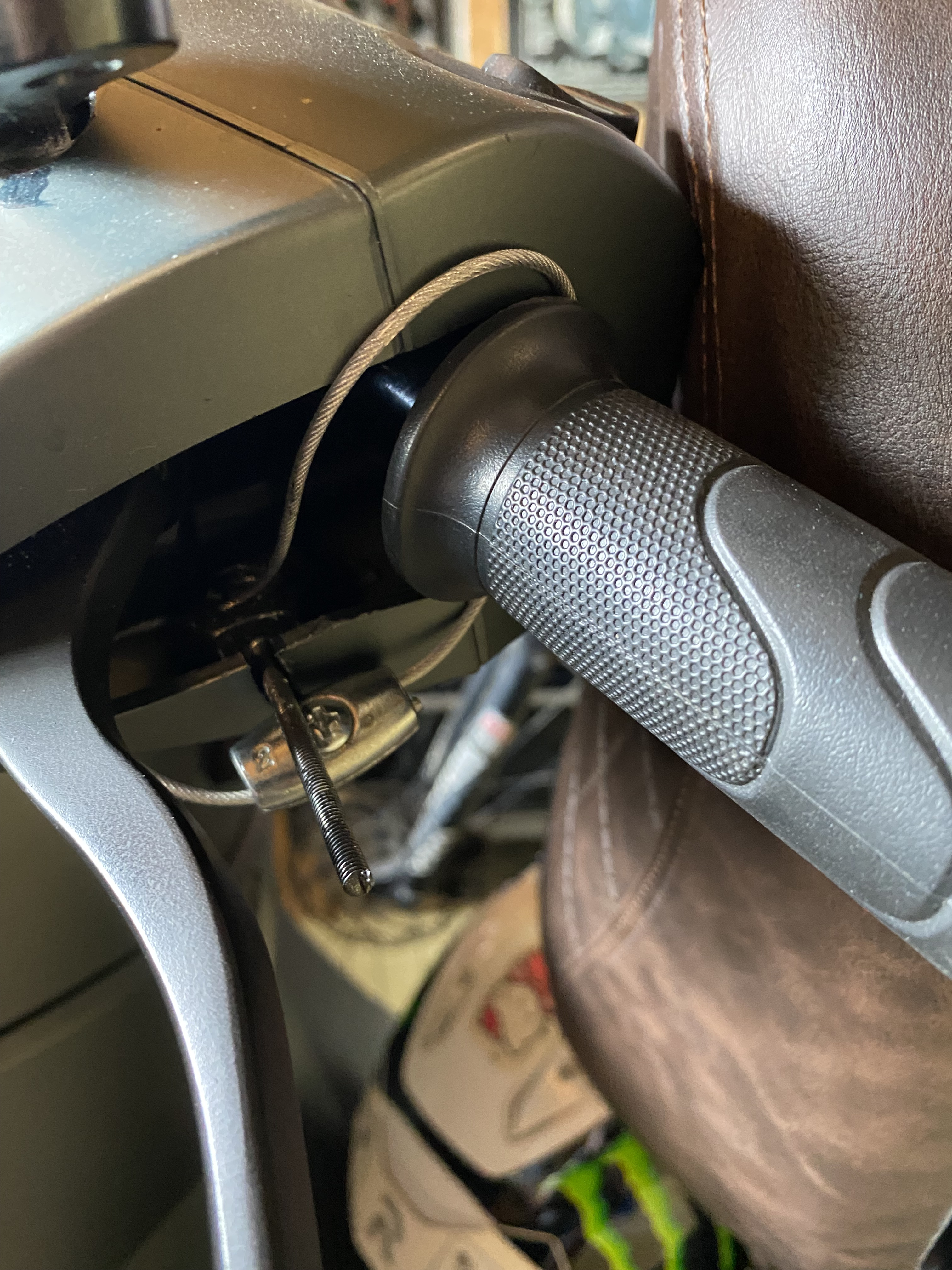 mit einem Drahtseil gegen verlieren sichern und auf der Unterseite der (Lenker-) Verkleidung mit einem Magneten in „Fahrposition“ verstauen.