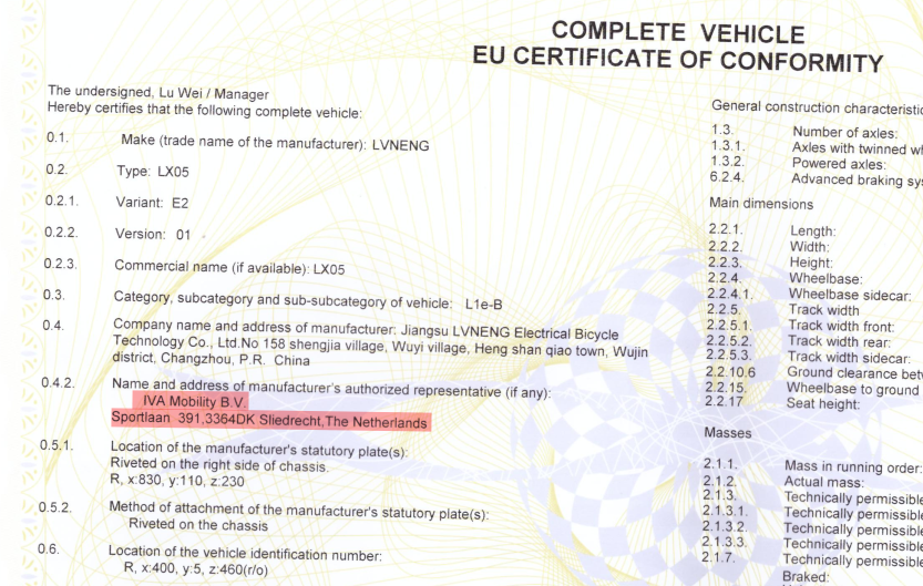 Bei mir im COC steht dort : IVA Mobility B.V. Sportlaan 391, 3364DK Sliedrecht, Niederlande