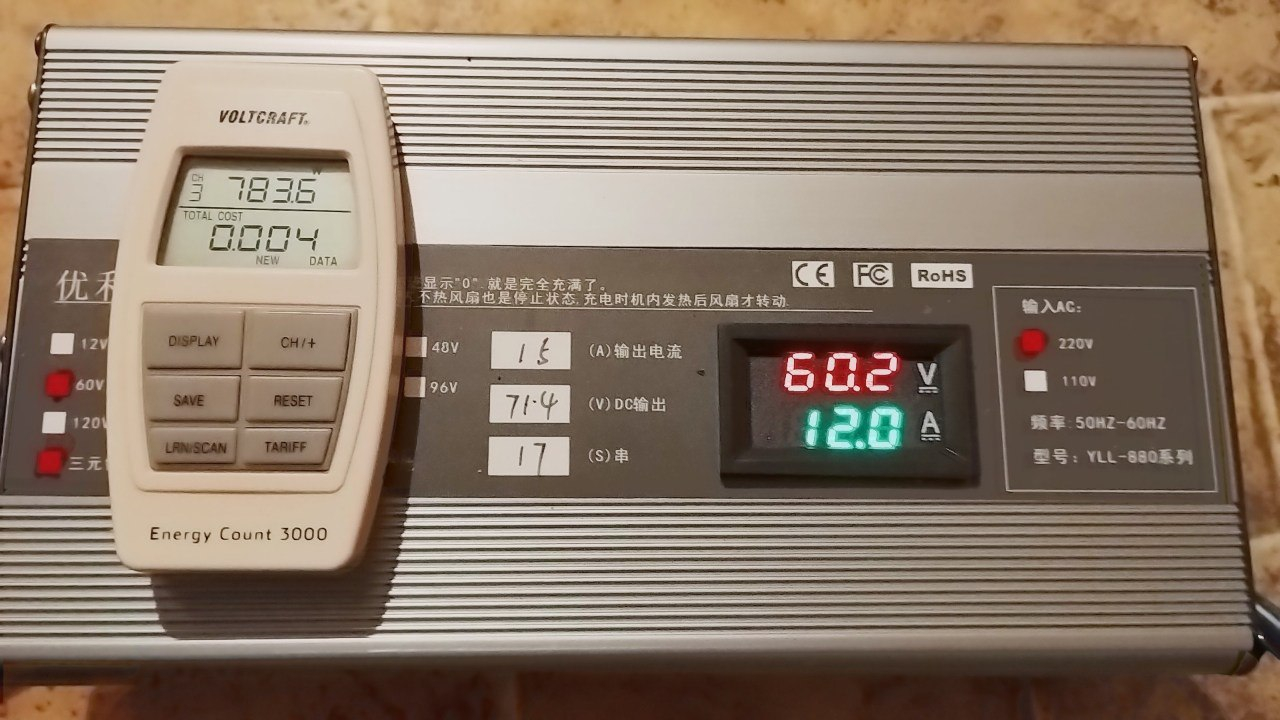 Das ist ganz normal während der anfänglichen Konstantstrom Ladephase! Es is ja keine Konstant-Leistungsphase… DEI Batteriespannung steigt ja an, je voller der Akku wird. Gemäß P=UxI steigt somit die Ladeleistung an bis Richtung Ladeschlussspannung.guewer hat geschrieben:Seltsam bei dem Ladegerät ist, dass die Ladestärke während des Ladevorgangs nicht kontinuierlich abnimmt, indem die Amperezahl zurückgefahren wird, sondern, im Gegenteil, gegen Ende immer weiter zunimmt (Amperezahl bleibt bis zuletzt bei 12 A)! Stresst das nicht den Akku übermäßig und verkürzt dessen Lebensdauer?