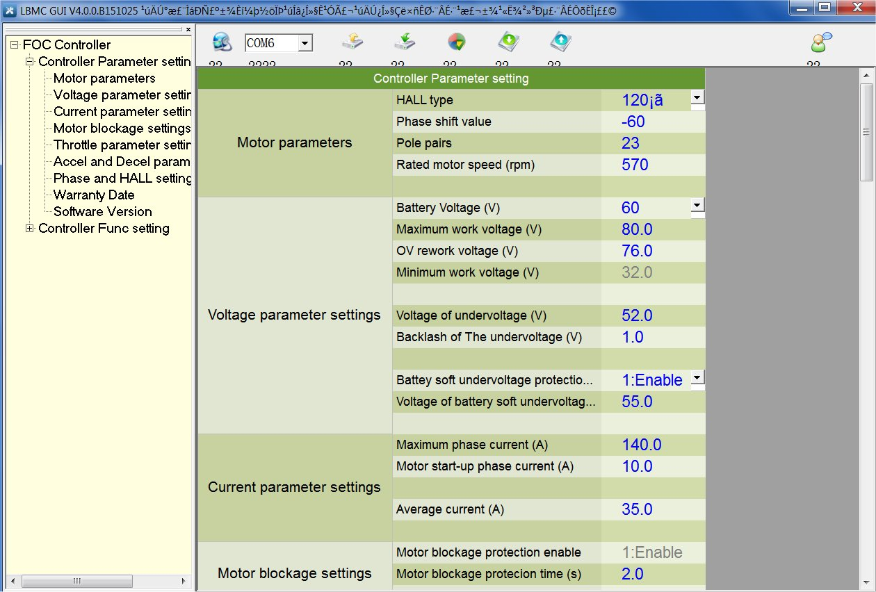 Heute habe ich die Daten des ERetro Controllers ausgelesen. Es hat auf Anhieb geklappt, COM6 ist bei meinem Laptop der kommunizierende Port. Ich hab die Werte mit Export gespeichert. Mehr habe ich noch nicht unternommen. Beim Controller handelt es sich um einen "ZNEN ZWK060035-B", er hat 60 Volt Spannung und 35 A Strom (Dauerstrom?).