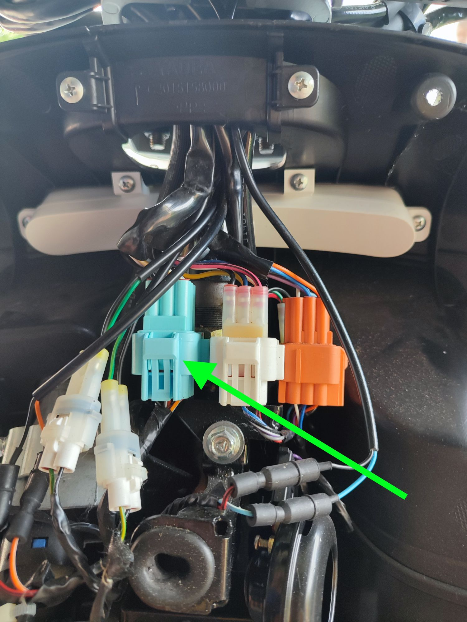 Sofort sichtbar war, dass der türkise Steckverbinder nur locker aufgesetzt war - den habe ich richtig zusammengesteckt, dass er hörbar einrastet und nun fährt der Yadea wieder. Zudem habe ich einen strammen Kabelbinder am Lenkerkopf entfernt, jetzt haben alle Kabel etwas mehr Spiel.