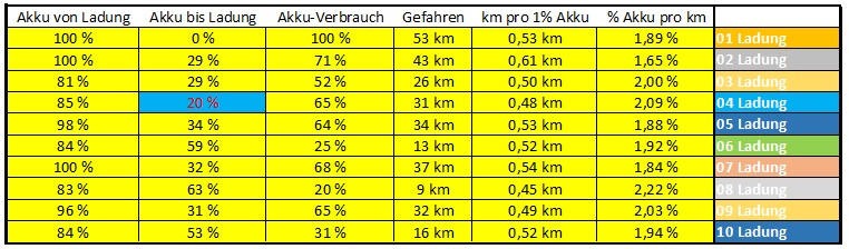 Nach nun genau 1506 km ist heute mal diese Lade- und Reichweitentabelle anhand meiner persönlichen Auswertung pro Fahrt und Ladevorgang entstanden. Ich habe alle meine Fahrten der letzten 500km getrackt - per GSP und Tacho. Die Abweichung auf meiner Kurzstrecke ist vernachlässigbar klein - in Summe so 5% höherer Tachowert als die vom GPS. Daher nehme ich den Tachowert, weil ich den bei der Fahrt immer vor mir sehe. Die "Restreichweitenanzeige in KM" ignoriere ich vollkommen. Die stimmt bei Kurzstrecken überhaupt nicht.