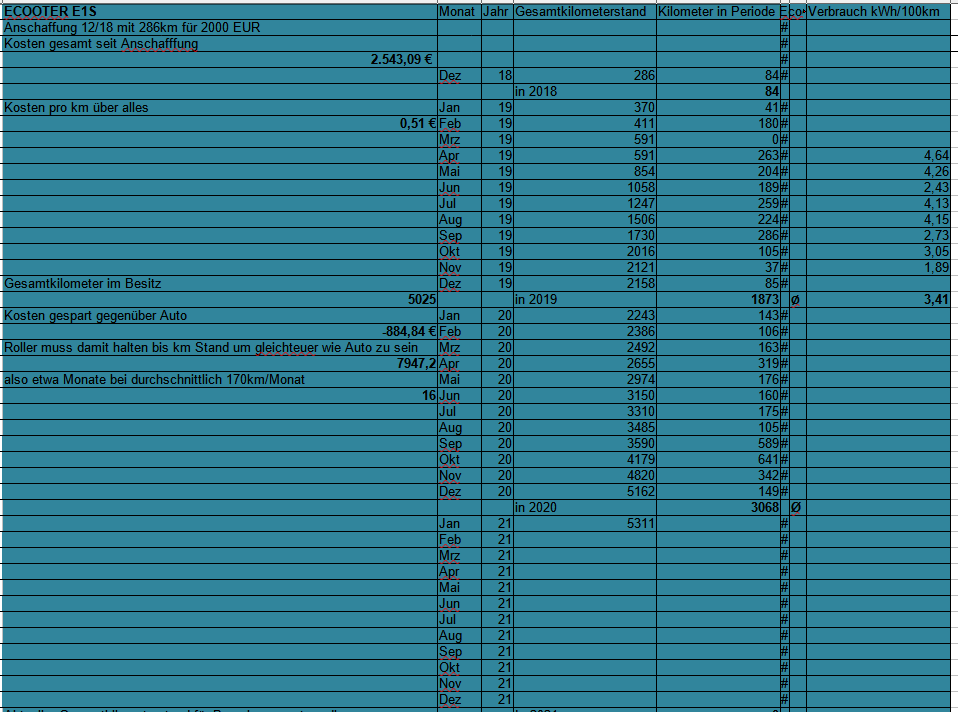 Jahresabschluss 2020, meine gewünschte Mobilität ist in diesem Jahr mit 10tkm/Jahr gleichgeblieben wie im langjährigen Mittel, die Kilometer mit dem Auto haben sich abermals verringert, dafür hat sich die Rollernutzung weiter erhöht auf über 3000 km dieses Jahr. Viel weitere Reichweite brauche ich gar nicht obwohl es natürlich gut wäre, 90km/h müsste er halt können, mit der gleichen Reichweite