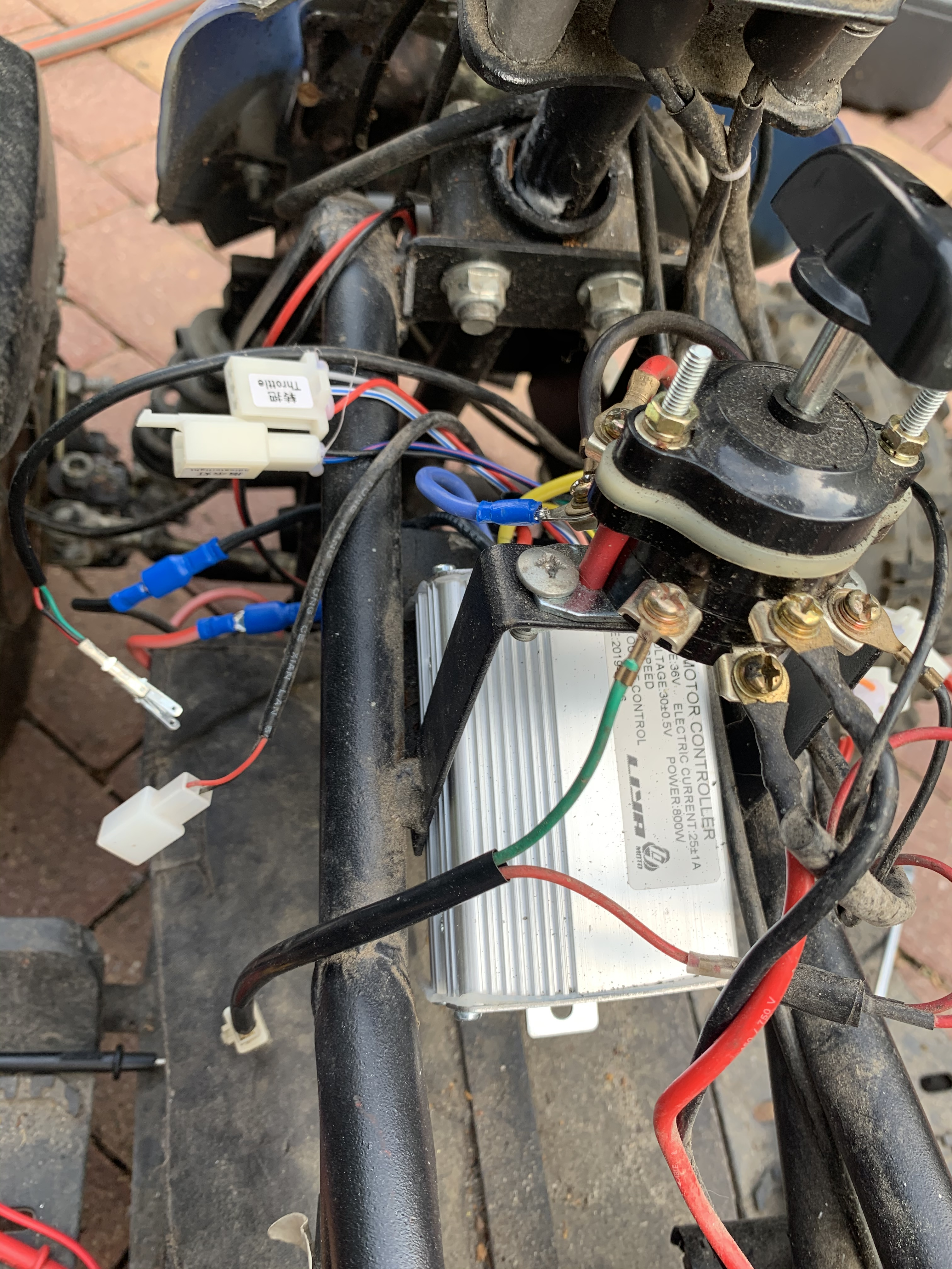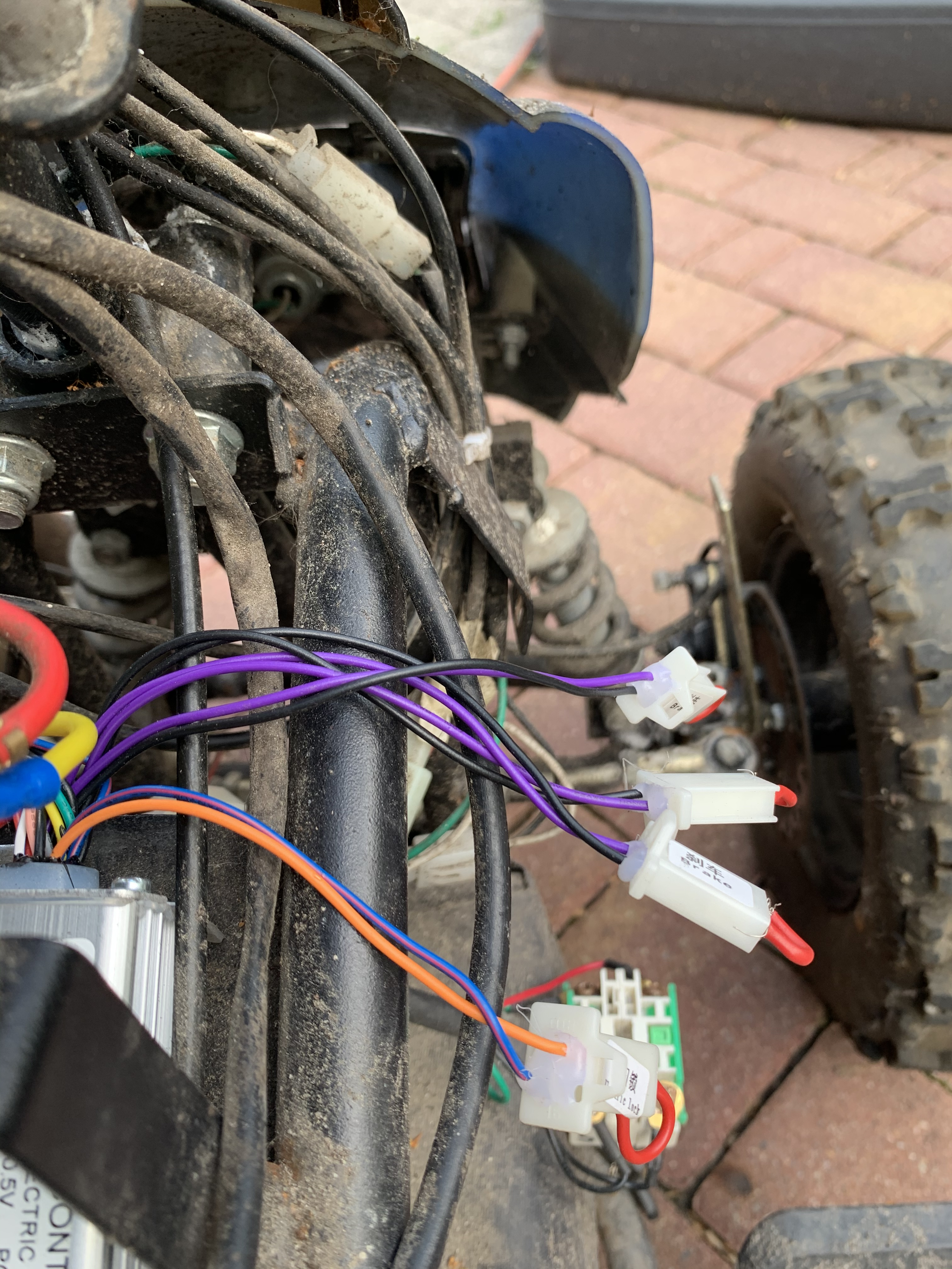 Von den drei Gas/Throtle-Kabel haben üblicherweise zwei eine kostante Differenz um 5V und das andere gibt je nach Betätigungsstellung einen Zwischenwert zurück an den Controller. Vielleicht hatte das Kinder-Quad bisher keine Gasregelung gehabt, sondern nur Vollgas über Pedalschalter.