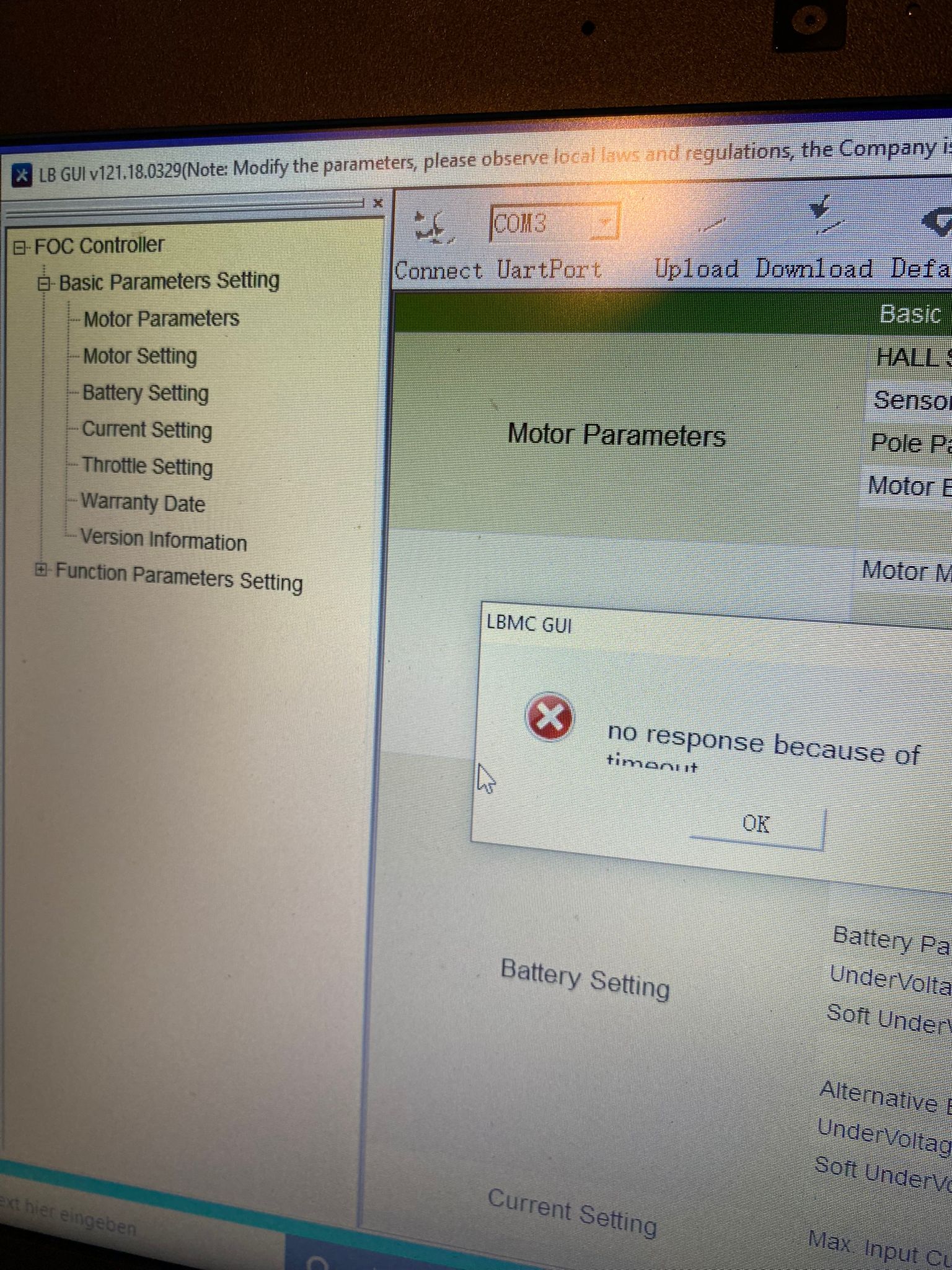 Ich möchte meinen LBC006 555D Controller mit meinem Notebook verbinden und dann mit der Software LB GUI v121.18.0329 die Werte ändern um ein wenig schneller zu fahren.