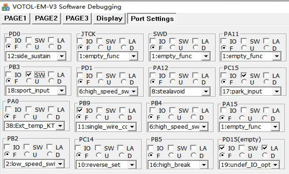Richtig, der Kommunikationsport zum Tachodisplay (Umschaltbar LIN-Protokoll / Hall-Simulation) liegt natürlich auch an fester Stelle (bei mir PB9) nur eben beim EM150SP mit anderem Stecker anders, als beim EM200SP (der meiner Anleitung aber nicht beschrieben ist) wo es wohl PA15 ist.
