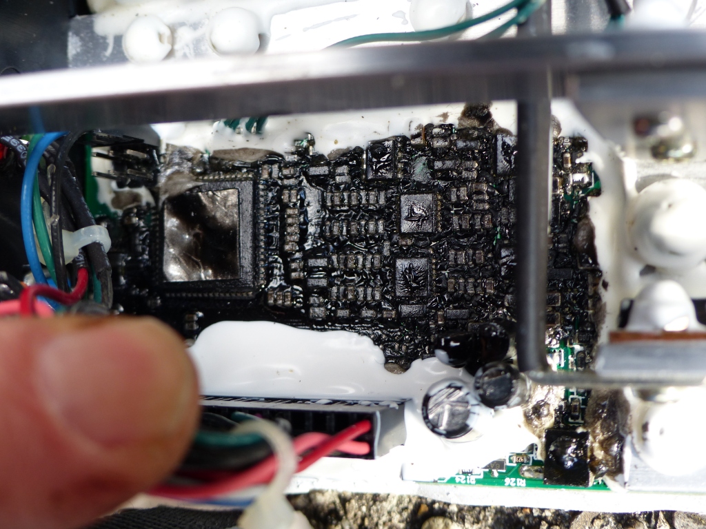 Die Platine selbst ist leider mit schwarzem Schutzlack überzogen, so dass man abgerauchtes dort kaum ausmachen können wird