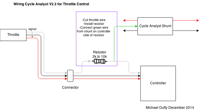 Der CA wird mit 6 dünnen Kabeln verbunden. Vom Drehgriff, hall throttle grip, wird über ein 2kOhm Widerstand vom "Schleifer" das Sollwertsignal auf den CA (dünnes grüne Kabel) geführt.