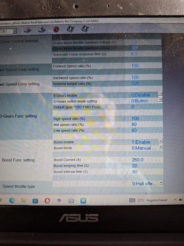 Zum Problem. Wenn ich beschleunige von Null auf z.B 50 und bei erreichen der 50 den Trottel nicht weiter drehe oder minimal zurückdrehe, geht der Regler gleich mit einem Ruck in die Recu anstatt gleichmässig weiter zu fahren. Nur beim ersten Beschleunigen. Passiert nicht , wenn ich dann weiter , nach dem Ruck beschleunige auf 60 70 80 etc. Dann geht sanftes weiterfahren.