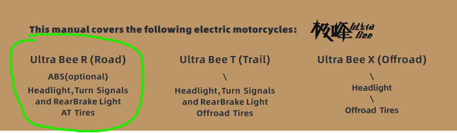 Ich habe gerade auf der offiziellen Sur-Ron Seite (https://www.sur-ron.com) heraus gelesen, dass es in Zukunft vl mehrere Versionen geben wird. Unter anderen eine Straßen Version mit ABS. Die "Ultra Bee R", ich nehme an, das aktuell bei uns angebotene Modell entspricht dann der "Ultra Bee T". Das Handbuch ist mit dem Datum 12. April 2023 hinterlegt, also kein Monat alt. (Erkennbar aus dem Link) https://surron-file.oss-cn-hangzhou.ali ... 230412.pdf