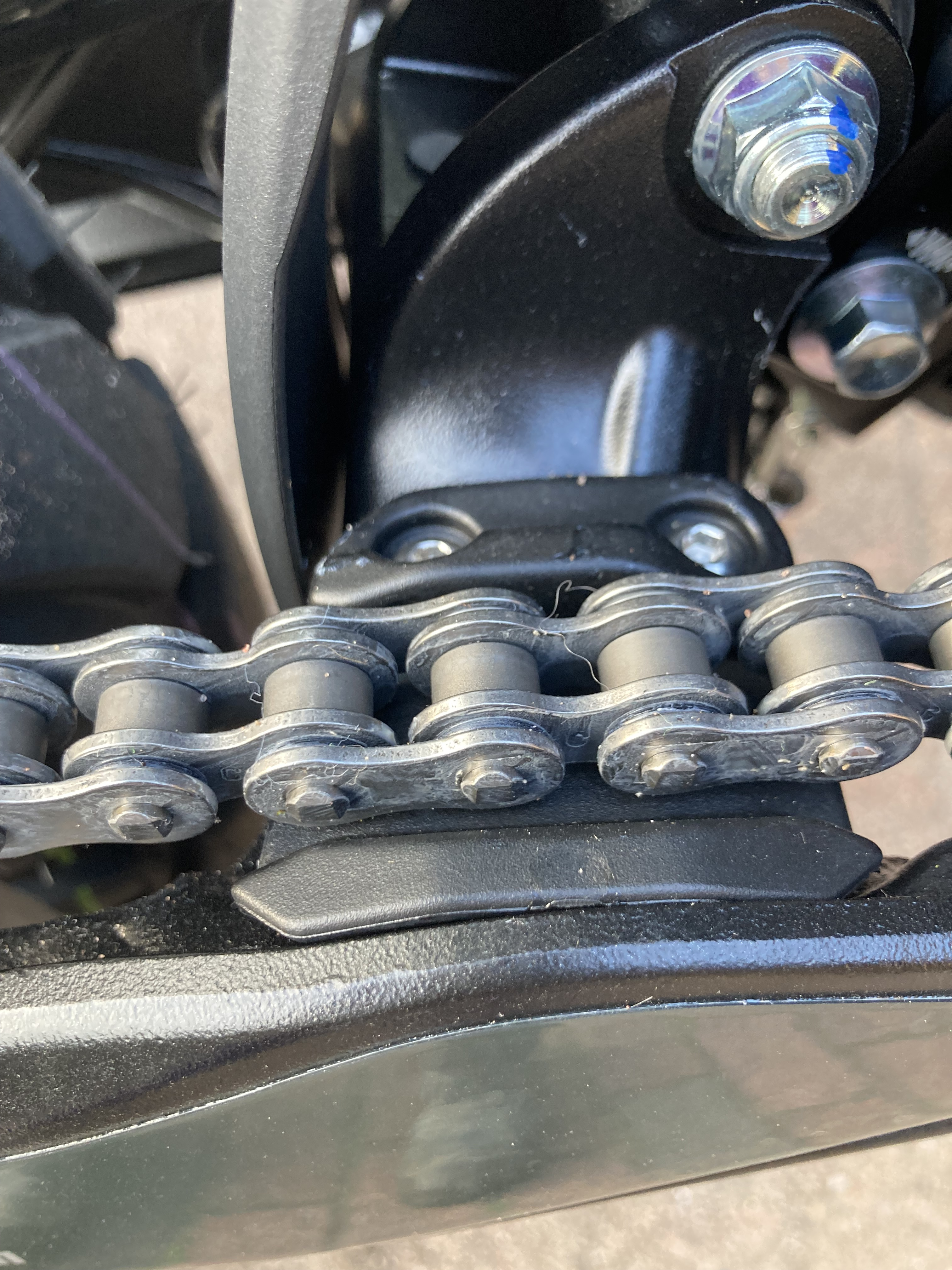 Die Schwinge hat oben eine Kettenführung aus verschleißfestem Hartgummi. Das wird schon eine Weile halten und ist doch gut gemacht. Bei meiner Ultra Bee war die Kette im Neuzustand etwas stramm. Die sollte etwas (ca. 1cm) Spiel haben damit es möglichst leicht läuft. Leider ist meine originale Kette eine billige O-Ring Ausführung die etwas schwergängig ist. Die üblichen X-Ring Ketten sind da wohl etwas leichtgängiger.