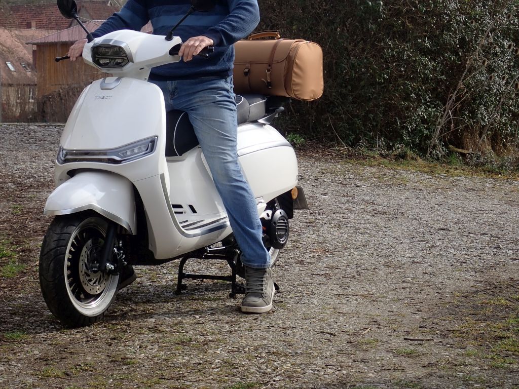 - Der Roller ist eher etwas für Menschen mit langen Beinen. Die Sitzbank ist erheblich höher als bei meinem Classico. Das Trittbrett ist auch höher, so dass die Sitzposition normal ist. Wenn man aber mit den Füßen auf den Boden will, dann merkt man die Höhe. Ich bin 1,77m groß. Wenn der Roller auf dem Hauptständer steht und ich darauf sitze, dann komme ich gerade so mit den Fußspitzen beidseitig auf den Boden. Ich muss mich dann schon ein bisschen anstrengen, um den Roller vom Ständer zu kriegen. Das liegt natürlich an den hohen Akkus, die unter der Sitzbank Platz finden müssen. Ich mach mal Fotos davon.