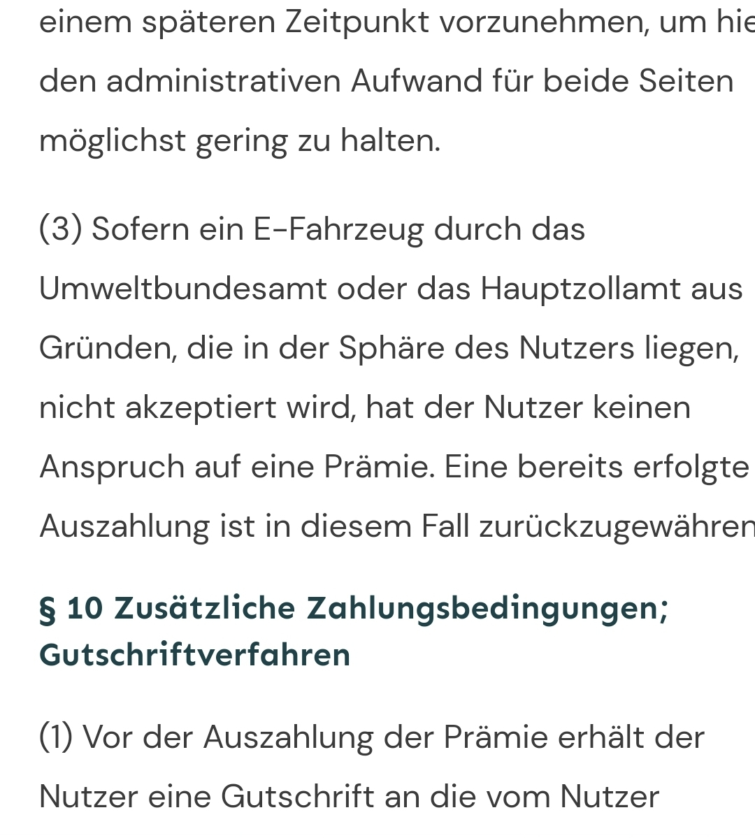 Stivikivi hat recht. Diese Klausel bezieht sich auf Verträge bei denen der Anbieter sofort auszahlt ohne etwas beim UBA eingereicht zu haben. Sollte dann das UBA feststellen dass das eingereichte Fahrzeug nicht Prämien berechtigt ist oder bereits eine Auszahlung erhalten hat, hat der Anbieter das Recht sich die Prämie zurückzuholen.
