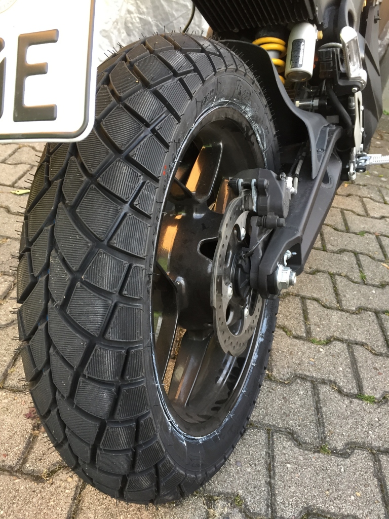 Zusätzlich ist sie jetzt so bereift, dass Herbst, Winter und Frühjahr kommen können. Leider ist der passende Hinterreifen der Metzeler Roadtec 01 Serie nicht lieferbar gewesen, so dass es doch die altertümlichen Heidenau K66 M+S wurden.