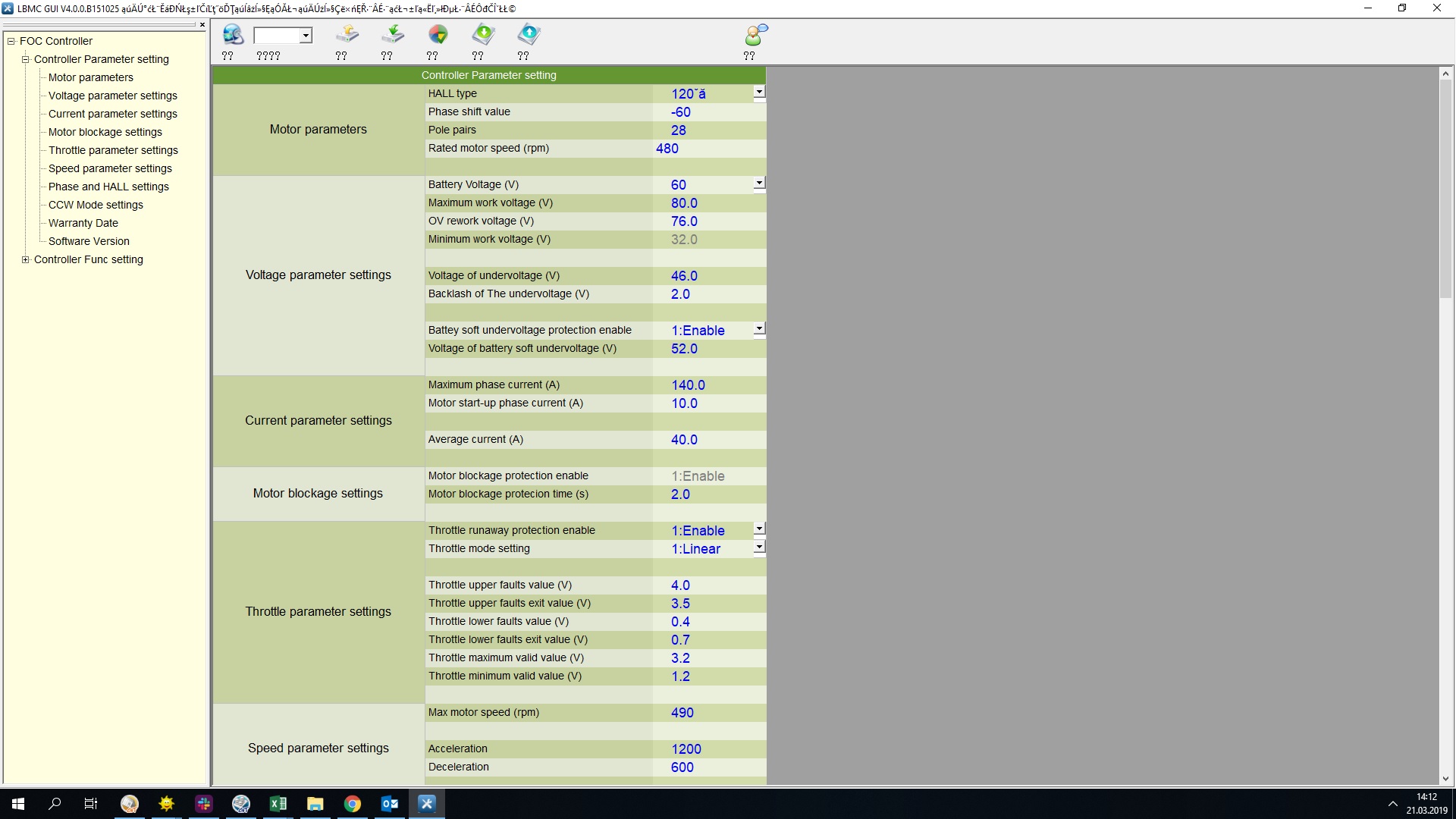 Ich habe speed limit disabeld, den max. Strom auf 140A eingestellt, den Anfahrstrom auf 18A, den Durchschnittstrom auf 44A.