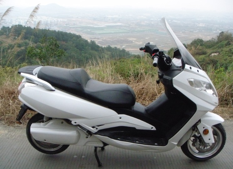 Deutlich zu erkennen sind der grüne e-Sprit Stecker-Aufkleber auf dem vorderen Schmutzfänger, und der große e-Sprit-Aufkleber auf der Schwingenverkleidung hinten. Scheinbar fehlt nur noch die EEC Zertifizierung von diesem Maxiroller, dann...