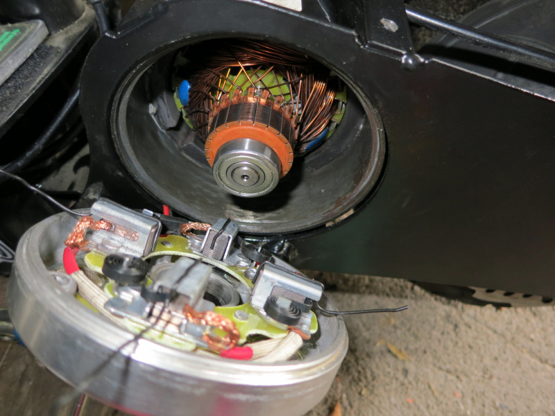 Also zuerst das Motorgehäuse mit dem Rotor im eScooter wieder eingebaut, dann habe ich die Kohlen zurückgeschoben und mit einem dünnen Draht fixiert. So bekam ich die Kohlen über den Kollektor, und dann den Draht herausgezogen. Klappte gut, nur der Motor lief nicht.