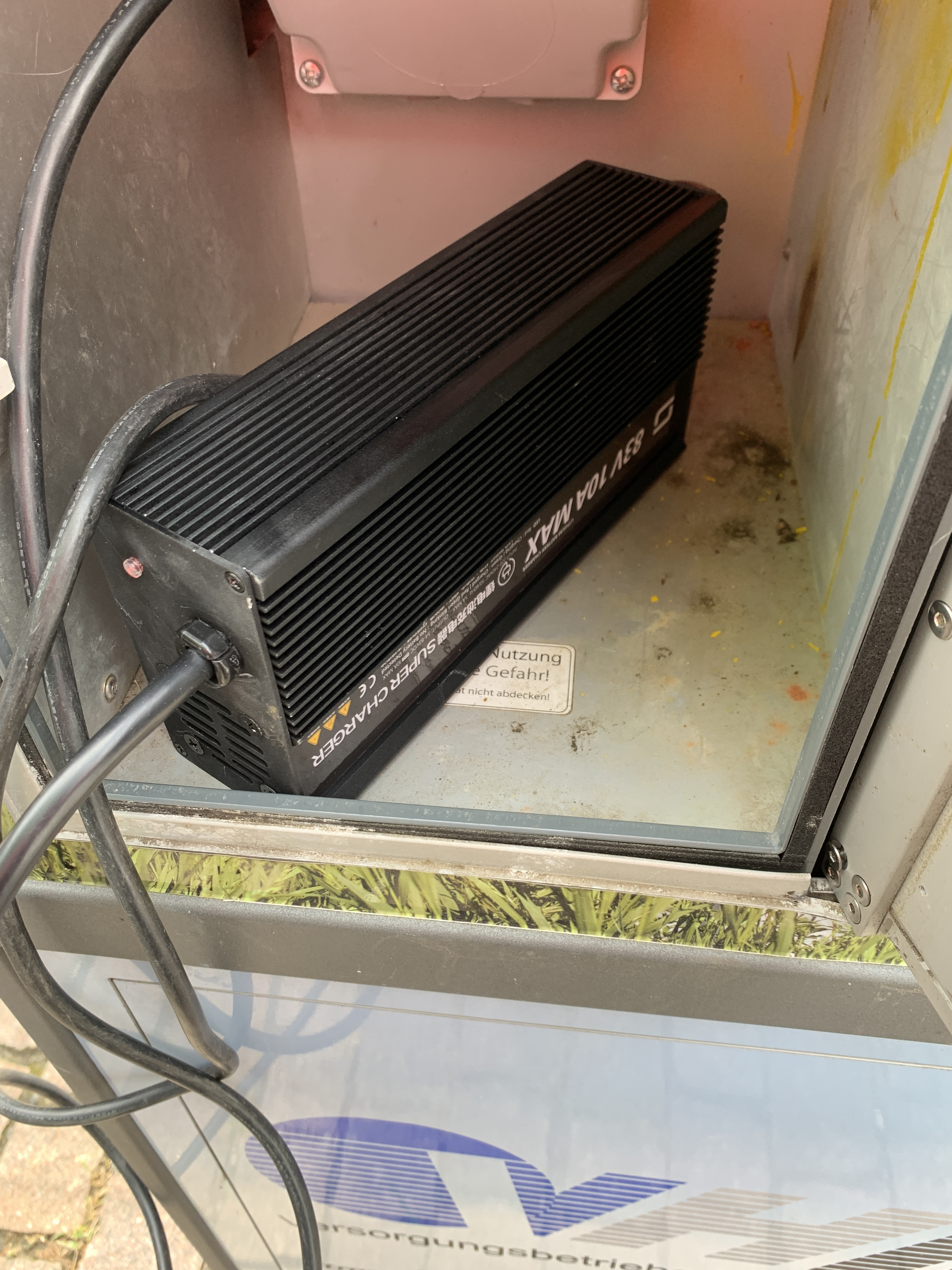 So, den Original Schnelllader haben wir zum Laufen bekommen, natürlich auch an der Buchse außen. Wird aber noch was dauern, bis das verkaufsfähig ist. Und billig wirds auch nicht, dafür steckt zu viel Arbeitszeit pro Lader drin. Aber was tut man nicht alles um die Garantie des 3.000€-Akkuklotz zu erhalten... Innerhalb einer Stunde Laden haben wir etwa 25% nachgetankt.